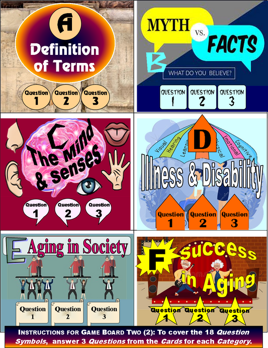J-01.02 a & b Get 3 Versions (T/F, Multiple Choice, Short-Answer) of Questions & Answers About A. Definitions of Terms / B. Myth Vs. Fact With the Subject Matter of The Game of Knowledge: Agreeable Aging on 108 Two-Sided Cards