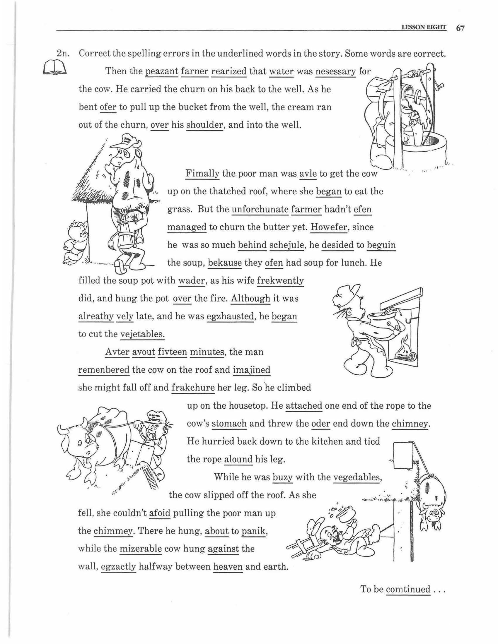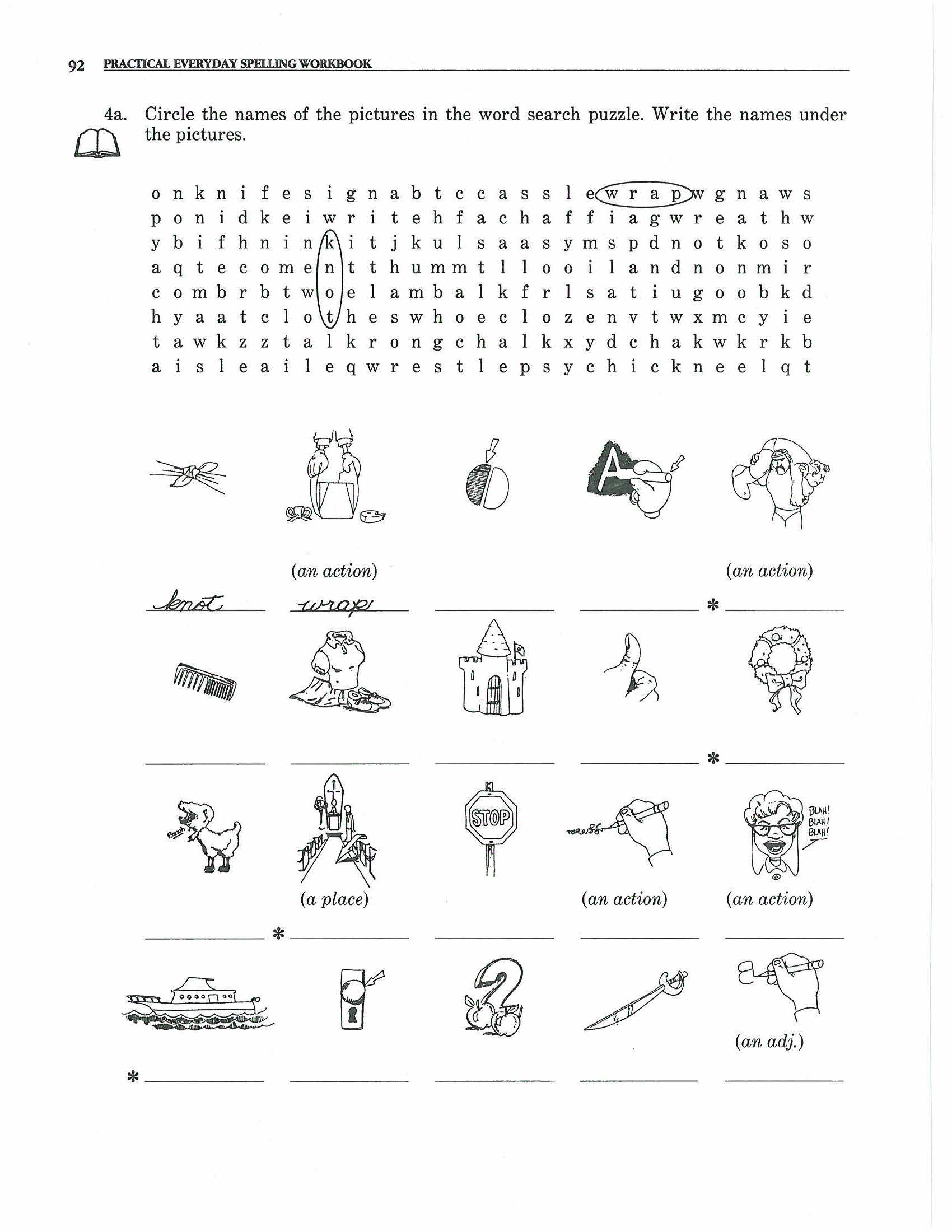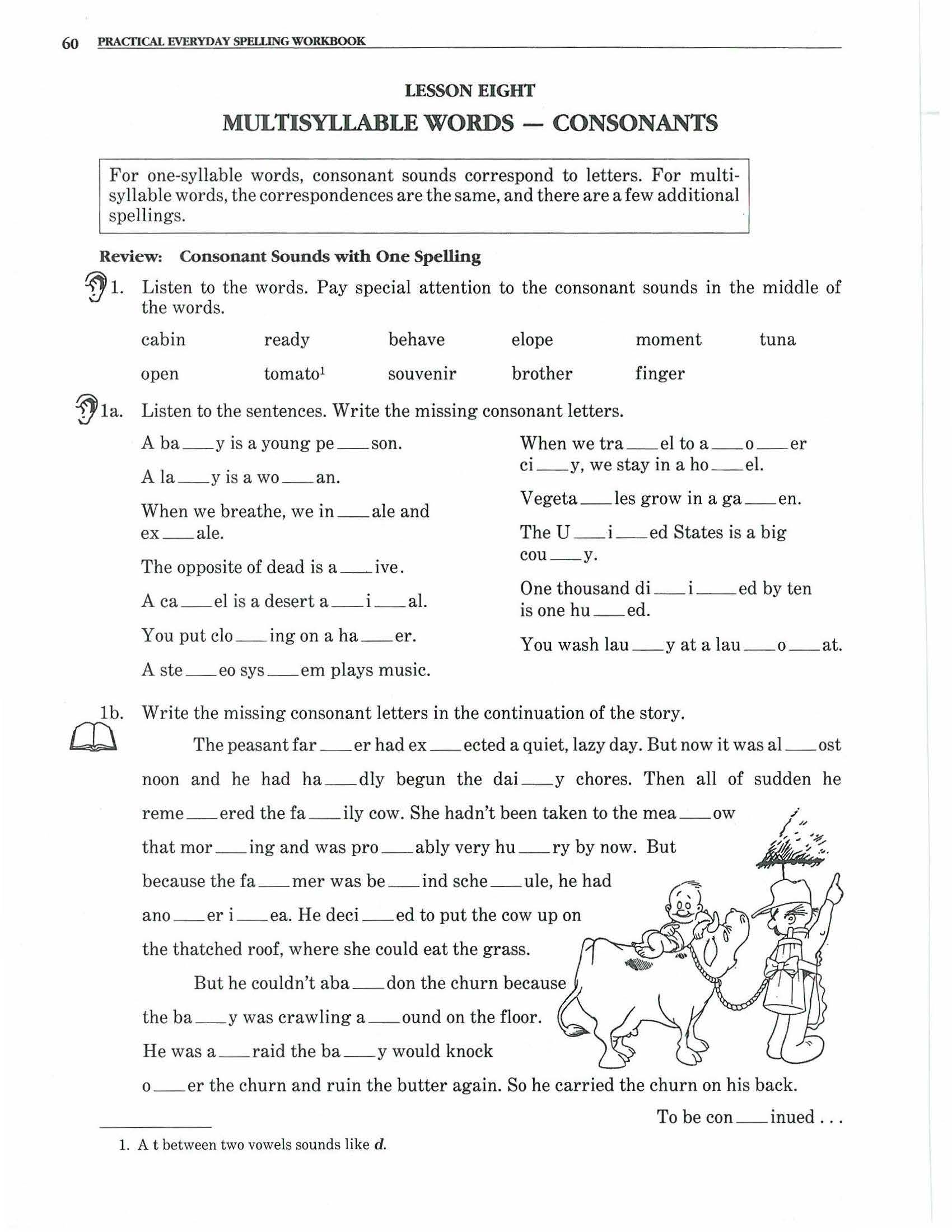 [1] In Lesson Eight of PESW (“Multi-syllable Words—Consonants”), review consonant sounds always spelled the same in the middle of words. Then cover sounds with various spellings by reading the “rules,” hearing typical vocabulary, filling in its letters, completing phrases and sentences with missing spellings, correcting errors, and matching items with their meanings. Learn about doubled consonants in medial position.