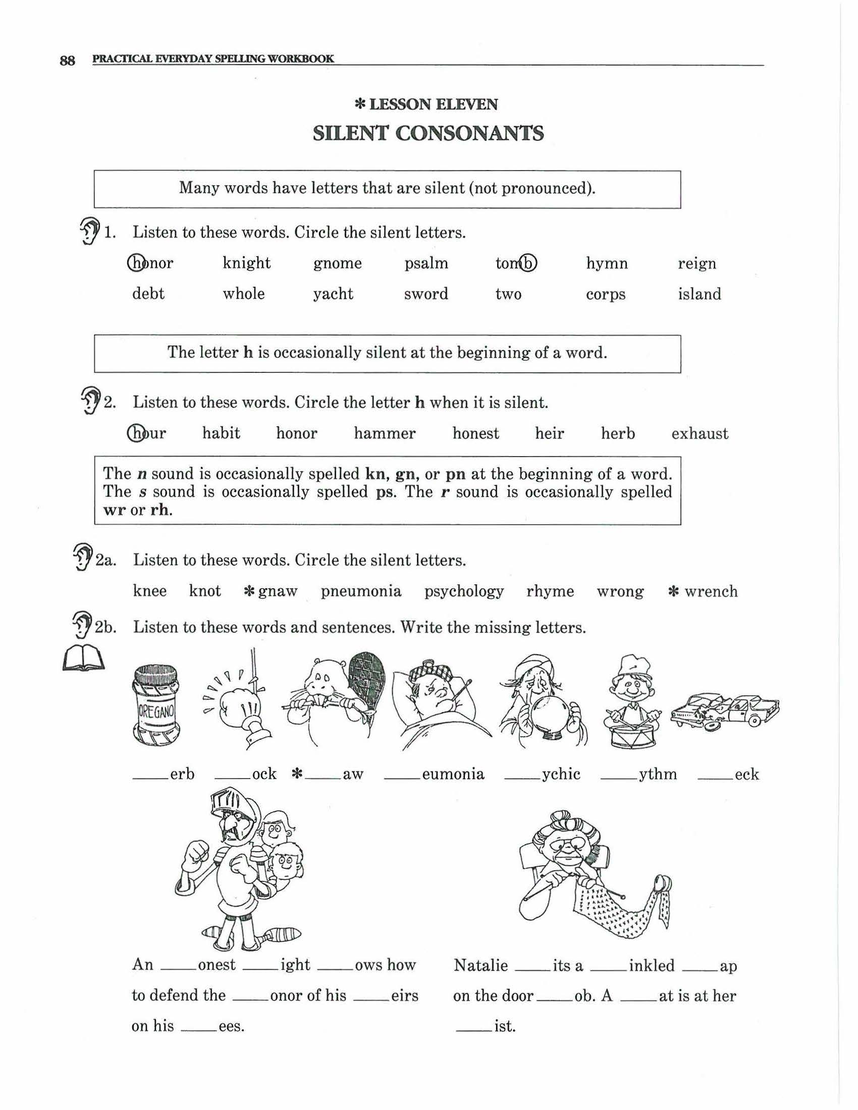 [2] In Lesson Eleven (“Silent Consonants”), hear words with consonants that are not pronounced in combination to other letters at the beginning, in the middle, and/or at the end of words. Do exercises and puzzles that compare words in which the same letter is pronounced or silent. Notice homophones.