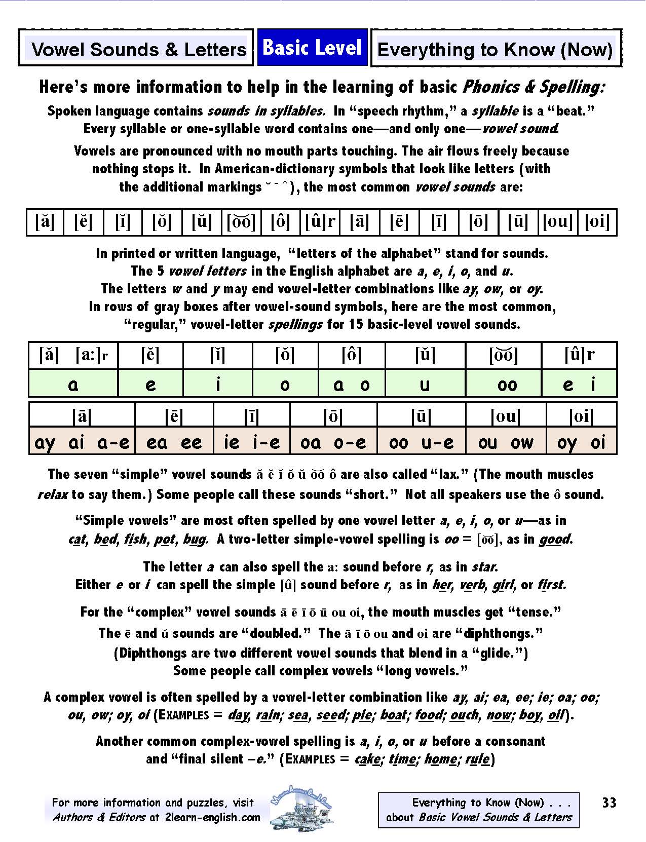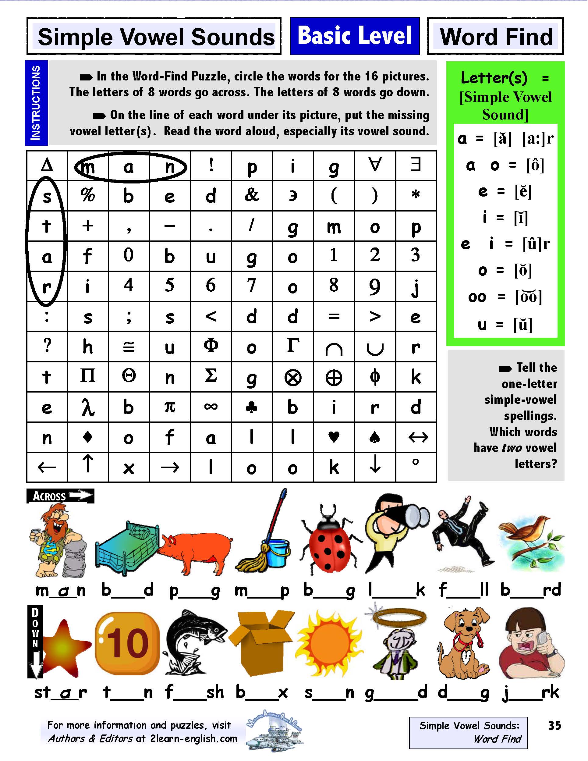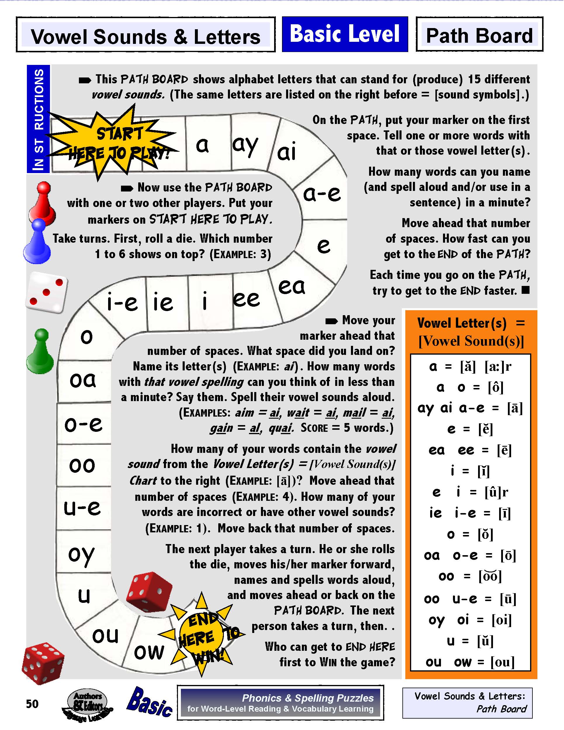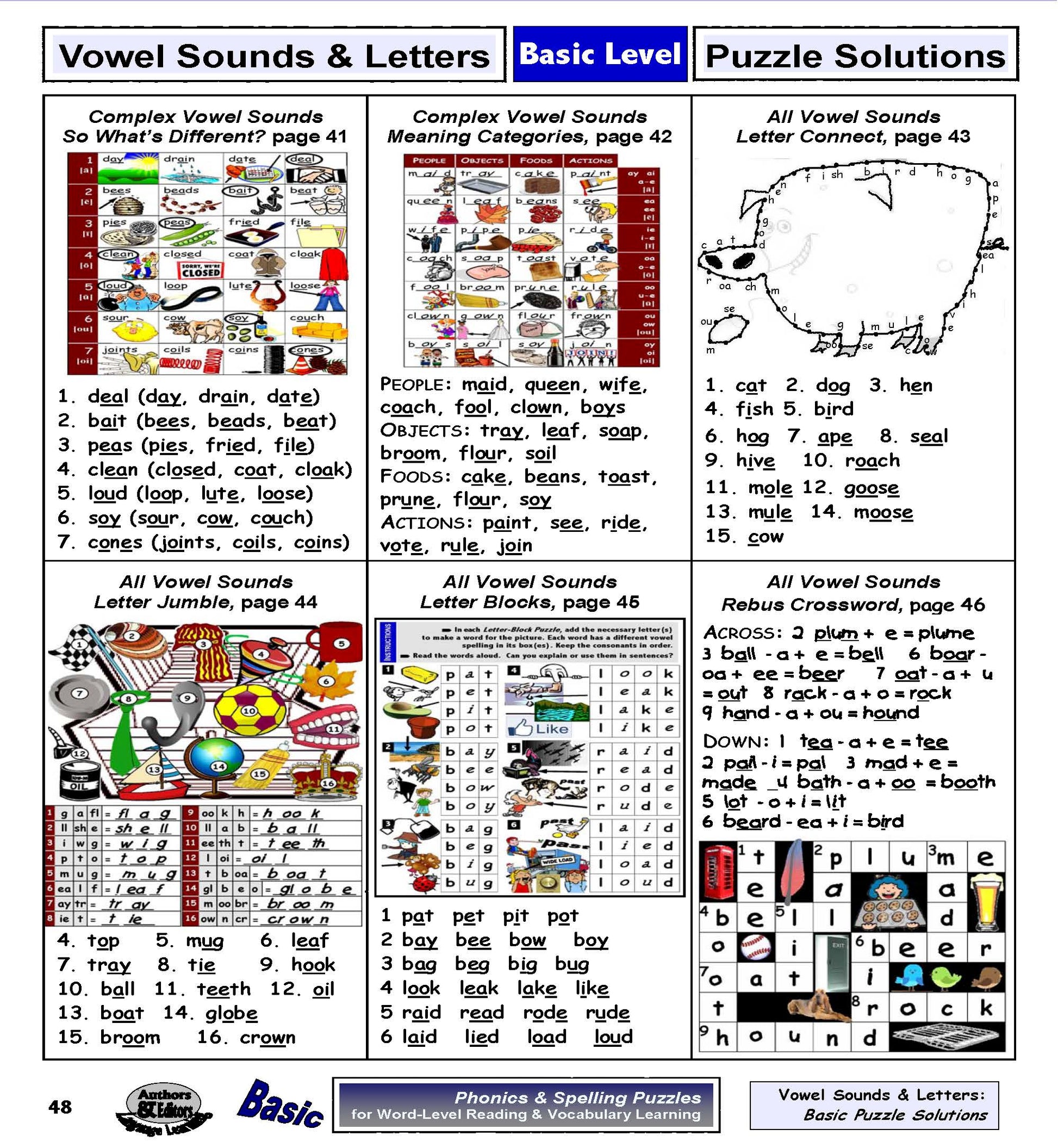 From Basic Phonics & Spelling Puzzles: 2 Pages of Pedagogy; 4 Pages Each for Simple, Complex, & All Vowel Sound Puzzles; 2 Pages for Puzzle Solutions, 1 Reference Word List, 1 Path Board18 Pages Who It’s For: Teachers & Independent Learners of the Most Frequent, Predictable Vowel Sounds & Spellings in Common One-Syllable Vocabulary Why You Need It: Puzzles designed to foster phonemic awareness help language learners and new readers to get used to vowel sound-letter correlations with less stress. After explanation, there are 12 puzzle varieties. These entertaining “instructional steps” become more challenging not only in format but in content: the relative frequency of their (illustrated) vocabulary items & their spelling patterns. What You’ll Do: [1] Use a two-page Intro for review or help in principles and patterns of Vowel Sounds & Spellings. Reference Charts are designed to help learners “get the point” in advance. [2] Do 4 puzzles (Word Find, Criss-Cross, Linked Words, Letter Choices) that focus on Simple Vowel Sounds; 4 (Word Maze, Switched Letters, So What’s Different? Meaning Categories) targeting Complex Vowel Sounds; and 4 (Letter Connect, Letter Jumbo, Letter Blocks, Rebus Crossword) that summarize and contrast previously covered patterns. Refer to Reference Side Bars when helpful. [3] Use the alphabetical Vowel Sounds & Spellings Reference List and illustrated Puzzle Solutions to check answers, to review, and/or to create and conduct related lessons and/or puzzle– or game-like activities. |