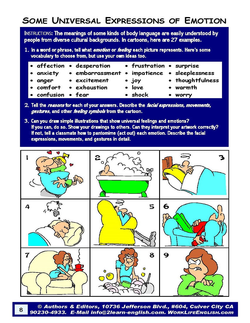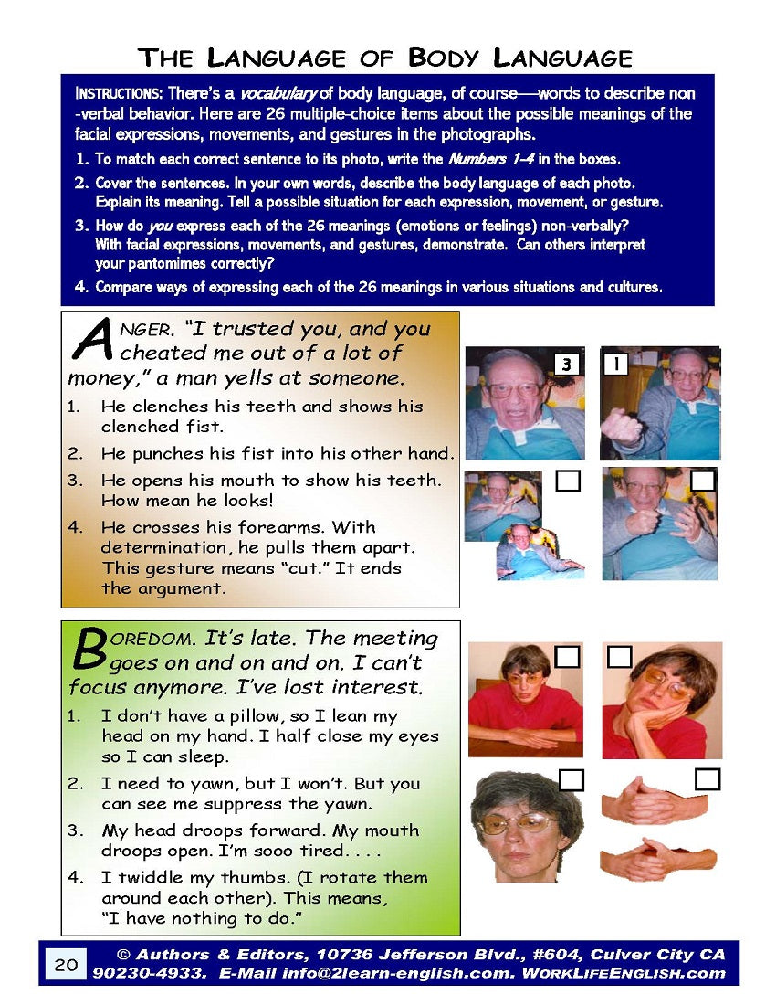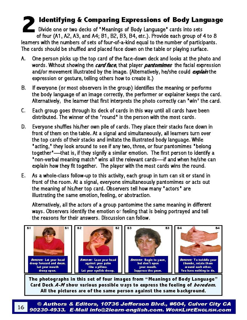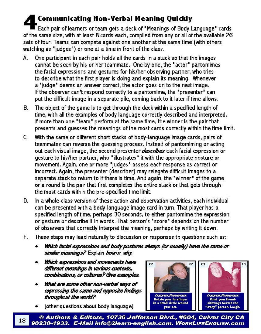 [3] Refer to the material in the 28-page E-00.01a Meanings of Body Language: Ideas & Materials for Teaching & Learning Non-Verbal Communication Through Facial Expressions, Body Movements, & Gestures whenever helpful in language-skills instruction and acquisition.