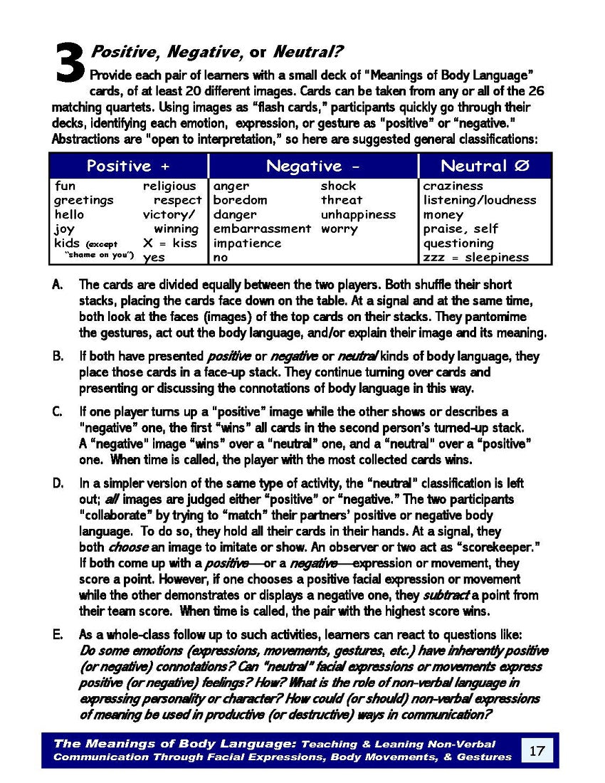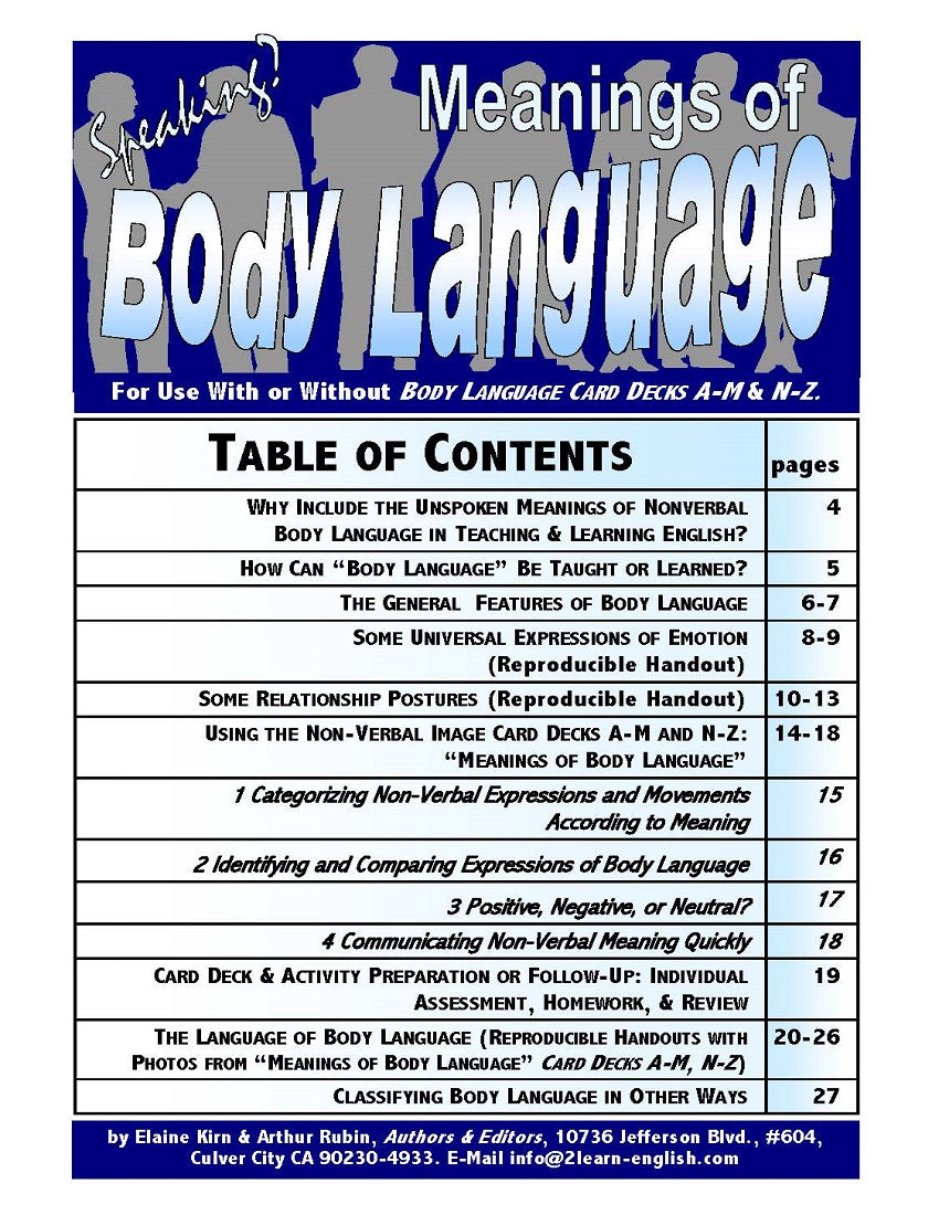 28-page How-to Book: Meanings of Body Language: Ideas & Materials for Teaching & Learning Non-Verbal Communication Through Facial Expressions, Body Movements, & Gestures