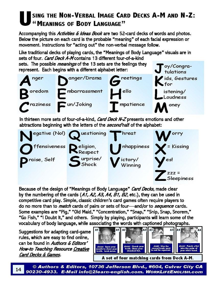 [2] From pages 14-19, get suggestions on how to Categorize; Identify; Compare; and Interpret (as Positive, Negative, or Neutral) at least 104 Expressions of Body Language. Reduced in size and explained on pages 20-26, these photographic images comprise the content of 00-01b Body-Language Cards A-Z.