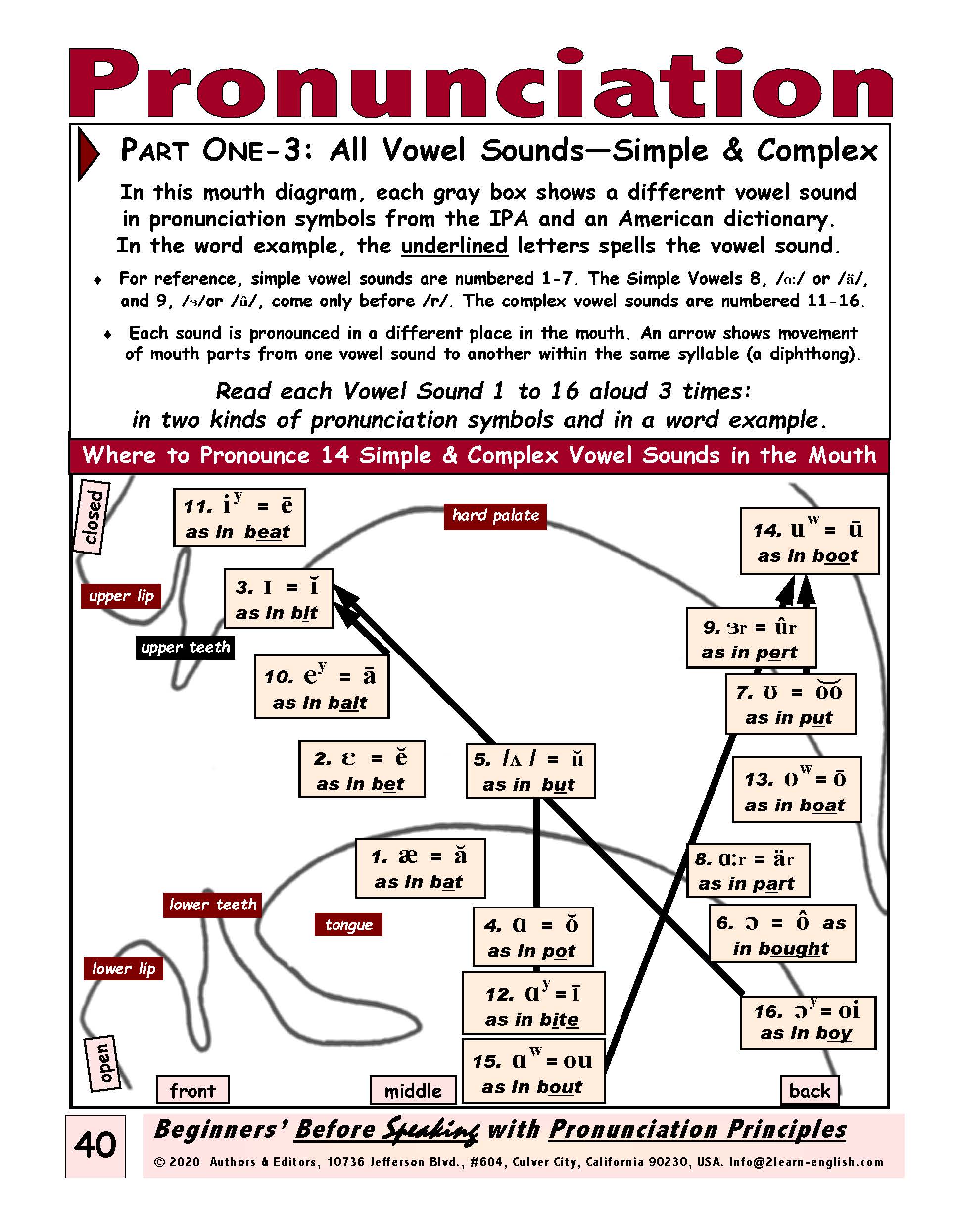 [1] Page 40 re-presents the “Vowel-Articulation Mouth Diagram,” this time displaying positions and movements of mouth parts for all 16 Simple vs. Complex Vowels 11-16. Use it to again practice perception + production of—and discrimination among—the Sounds / Ï= ², E= Ç, I= Ñ, A = Ú, ¿ = ô, O = Ú, U= oo / plus / ey = ª. iy = Â. ay = Ì. ow= Ü. uw = ñ. Aw= ou. Oy= oi /. Because these (numbered for reference) “audible units of speech” are displayed with both symbols and letters (in Key Words), the Infographic can function as a versatile teaching/learning tool—for review and “moving ahead” in Oral Language.