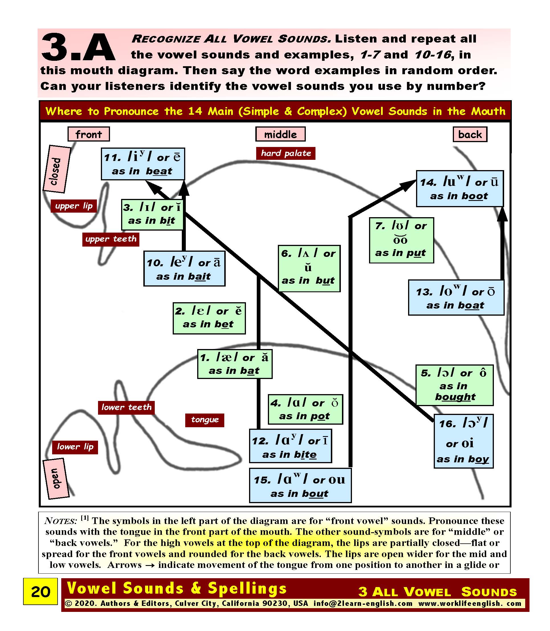 [1] Page 20 (re-)introduces high beginners to a 3.A “Mouth Diagram” with labels like “Front / Middle / Back,” “Closed / Open Lips, “ “Upper / Lower Lips / Teeth, Tooth Ridge / Hard Palate / Tongue,” and so on. It can be used in various ways for both receptive and active sound-discrimination of the 9 + 7 most distinct vowel sounds of American English: / Ï= ², E= Ç, I= Ñ, A = Ú, ¿ = ô, O = Ú, U= oo; ey = ª. iy = Â. ay = Ì. ow= Ü. uw = ñ. Aw= ou. Oy= oi /.