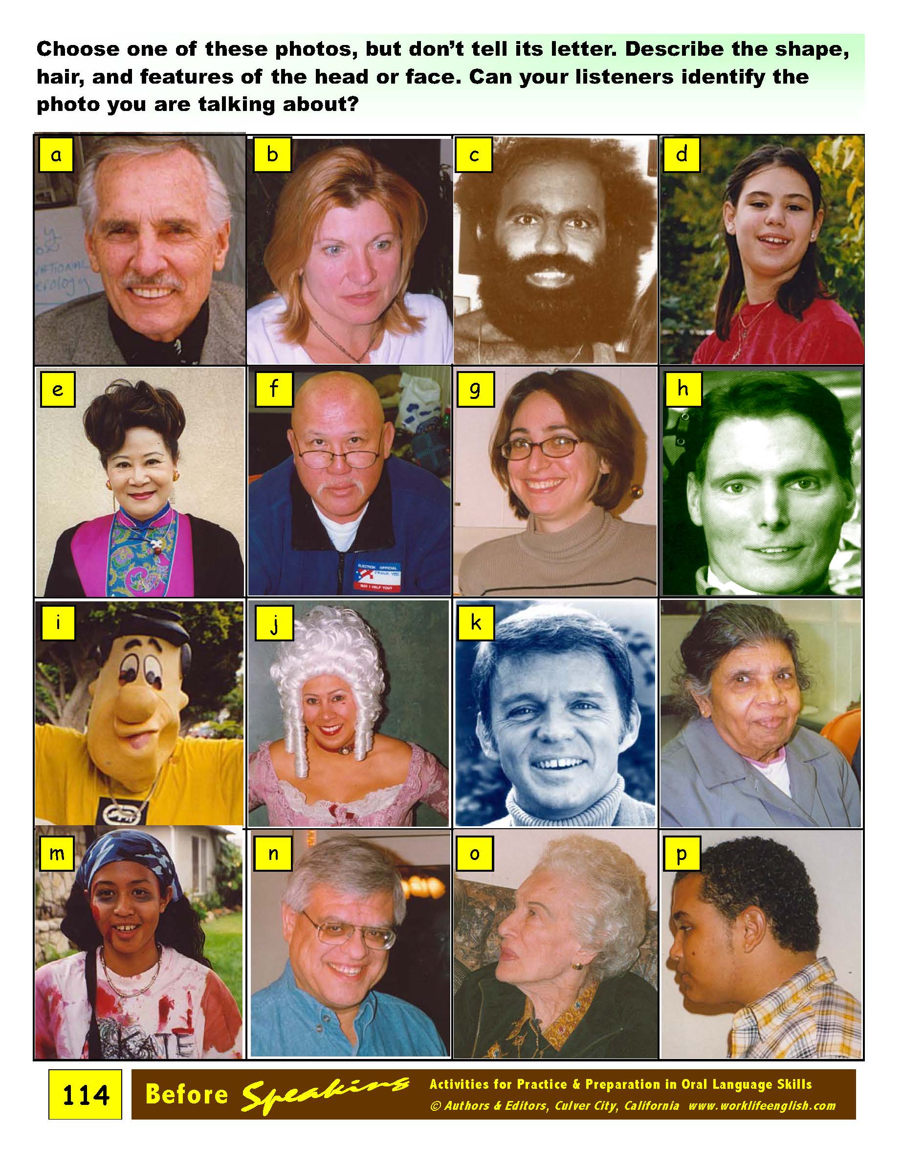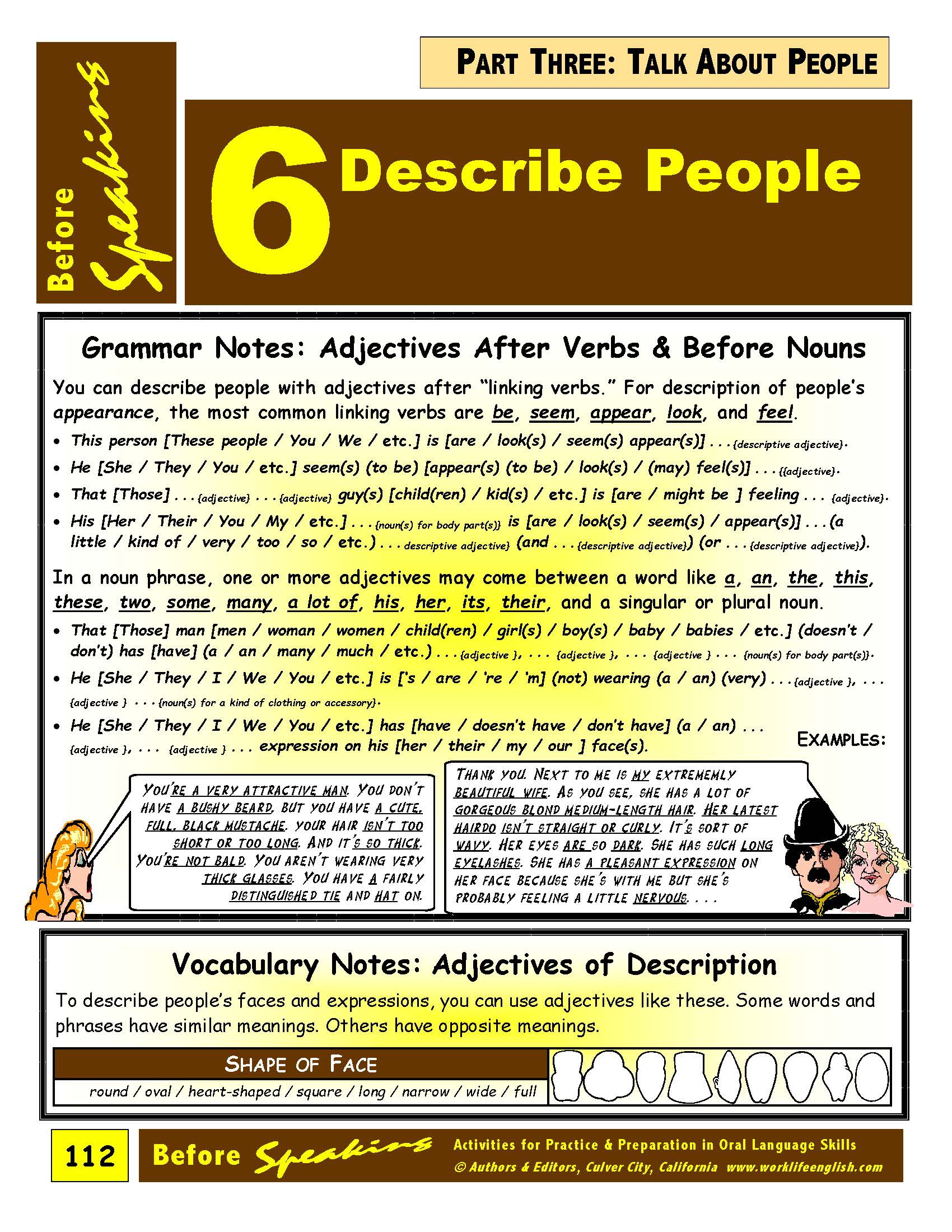 Before Speaking: Activities for Practice & Preparation in Oral Language Skills. Part Two, Talk About People: 7: Describe People, pages 111-130 + 26 Answer Key Pages Comprised of Suggested (Model) Responses