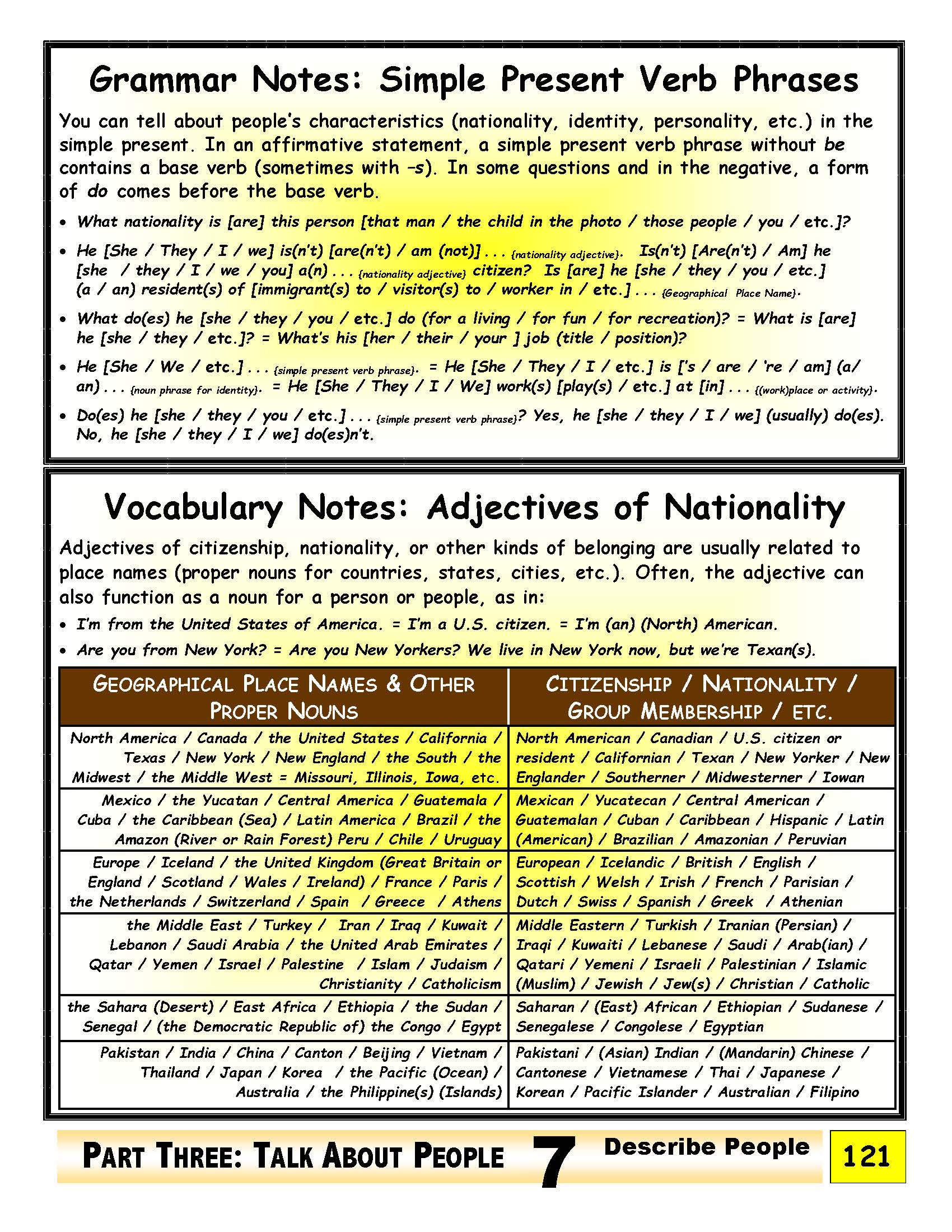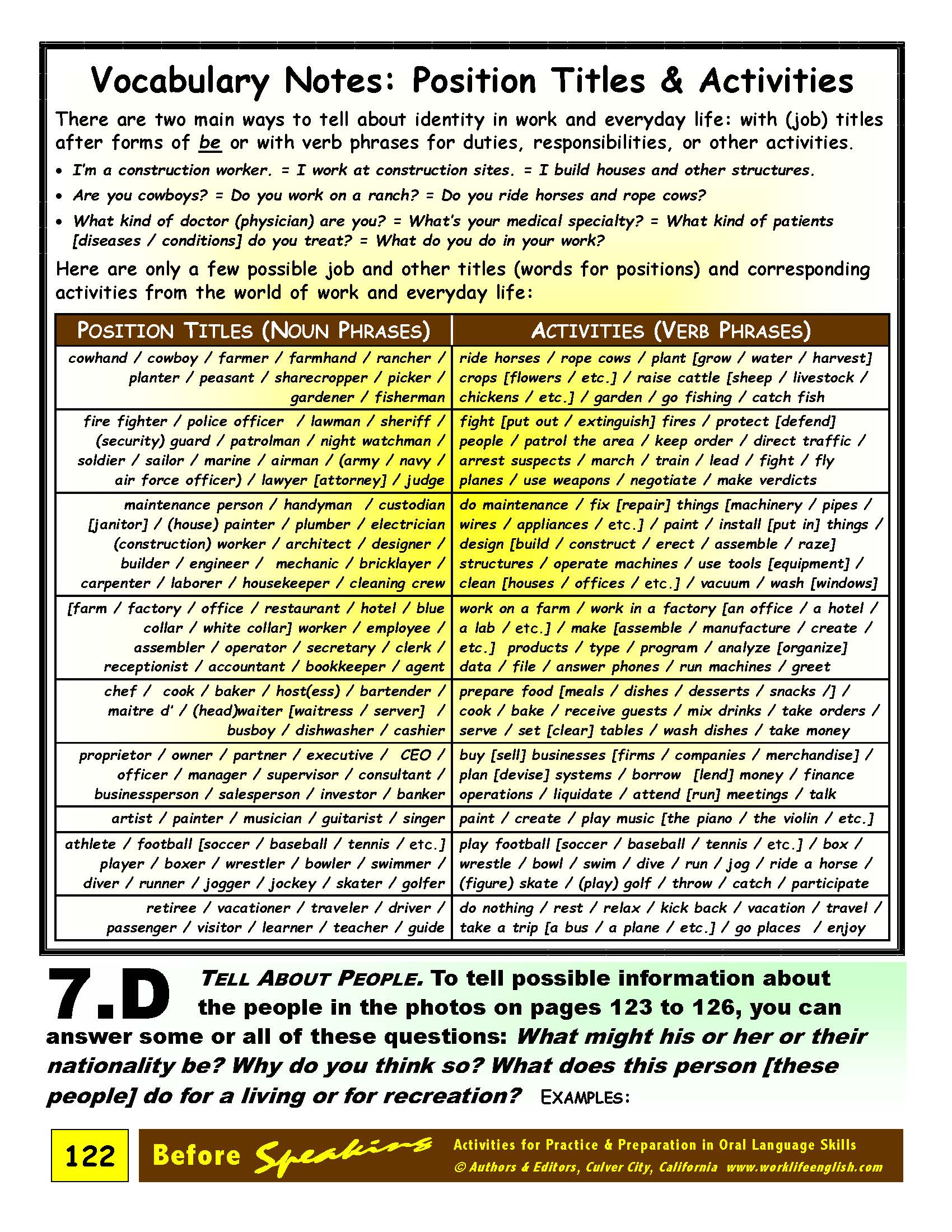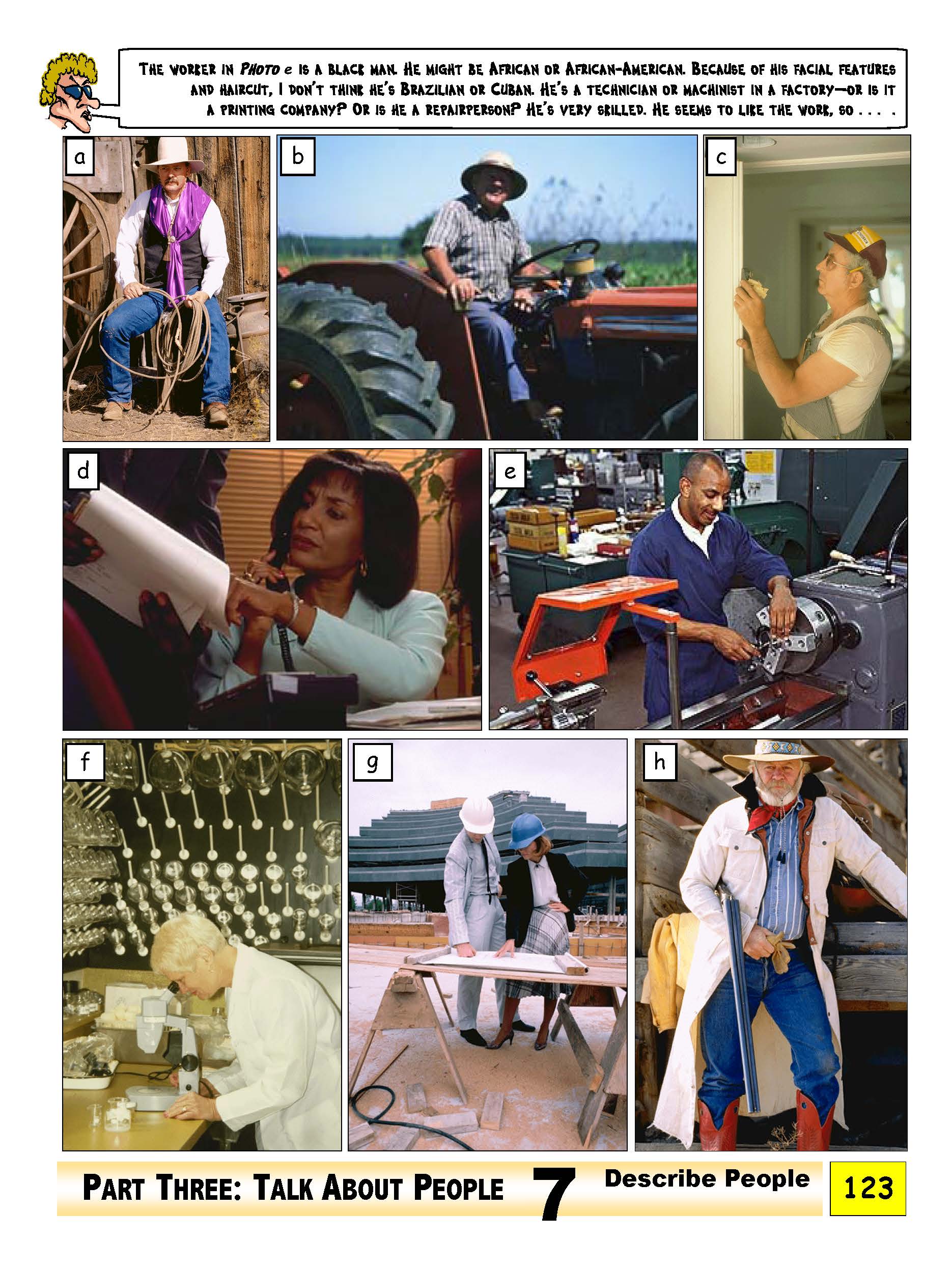 [2] On pages 112-115. follow Instructions 7.A with Adjectives that Describe Faces. On pages 116-120, in 7.B & 7.C characterize Facial Expressions, Feelings, & Body Language. (Re)View Adjectives of Nationality, Job Titles, & Verbs for Work Duties. Use these and your own words to describe individuals, pairs, and groups in Section 7-D of photos on pages 123-127. Differentiate among the visuals by telling how people look, what you think they are, what they probably do and are doing in those scenes.