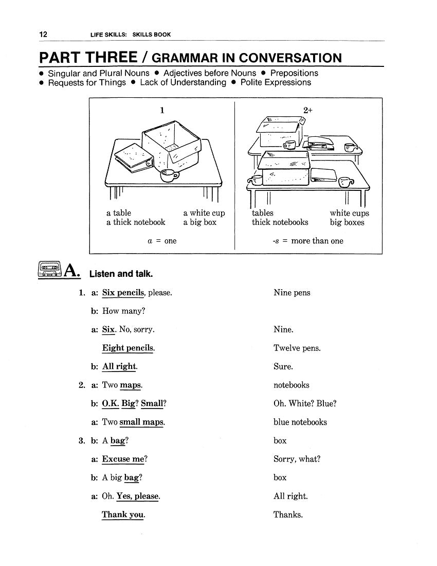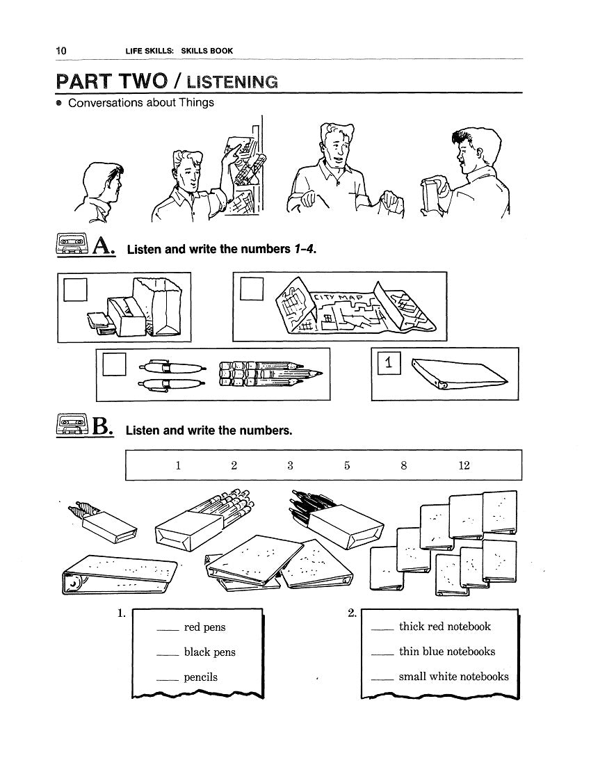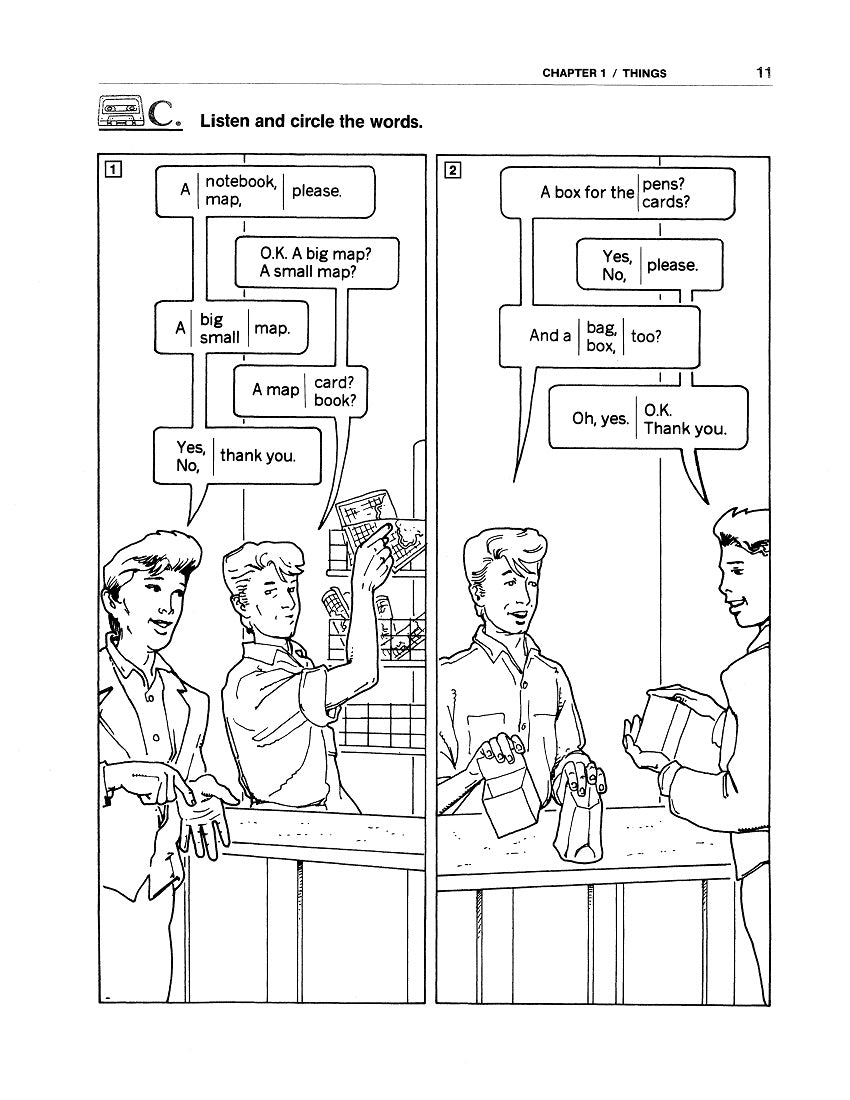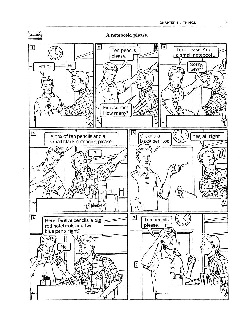 [1] On page 7, follow along in the text as participants hear the dialog in “A Notebook, Please.” If it’s accustomed—or if learners are helped by repetition, they can “act out” the story in pairs, probably all at the same time without commentary from instructors or aides. More observable modeling or coaching might take place when learners do and check Part One / Vocabulary exercises on pages 8-9.