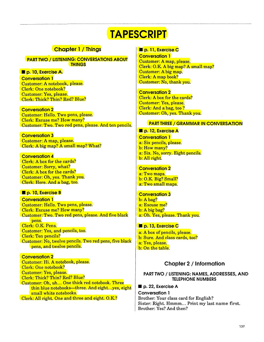 [2] Audio material for the Part Two / Listening tasks (on pages 10-11) can be downloaded and/or read aloud by speakers with (near) native accents from the highlighted text of the attached Tapescript page. Text users are to respond to what they hear by writing numbers, circling words, or the like. The Audio can be repeated as many times as necessary or helpful. Learners may even want to repeat it.