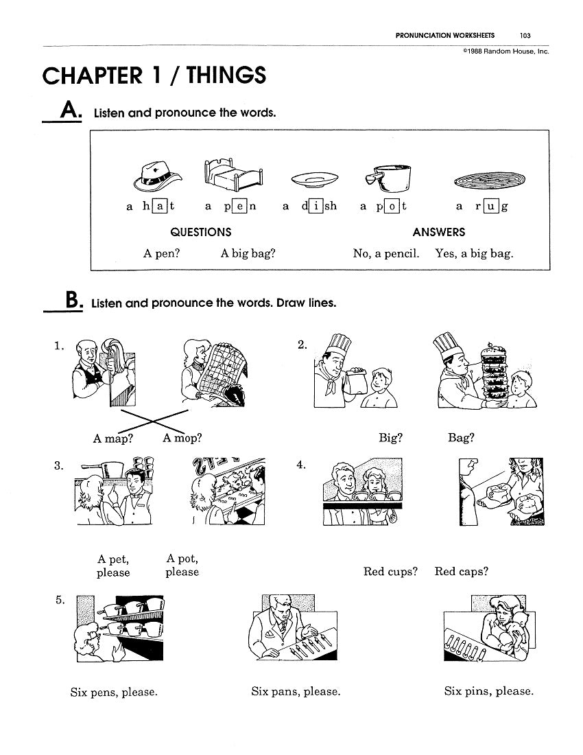 [4] Use the bonus Pronunciation Worksheets and Tapescript to reinforce the reception & production of names of “Things” containing “Simple Vowel Sounds.”