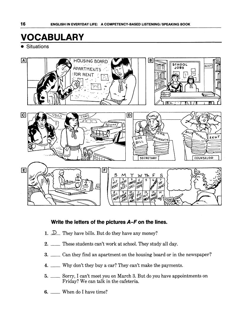 [1] In the page 15 Opener, notice that the instructional aims of the material are to help learners attain these Competencies: Understand & Describe Problems; Suggest, Accept, & Reject Solutions; Express Understanding; Use Calendars for Scheduling. Grammar in Focus topics are “the Simple Present” / “Kinds of Nouns.” On the Vocabulary page, there are illustrations to match with sentences about problems.