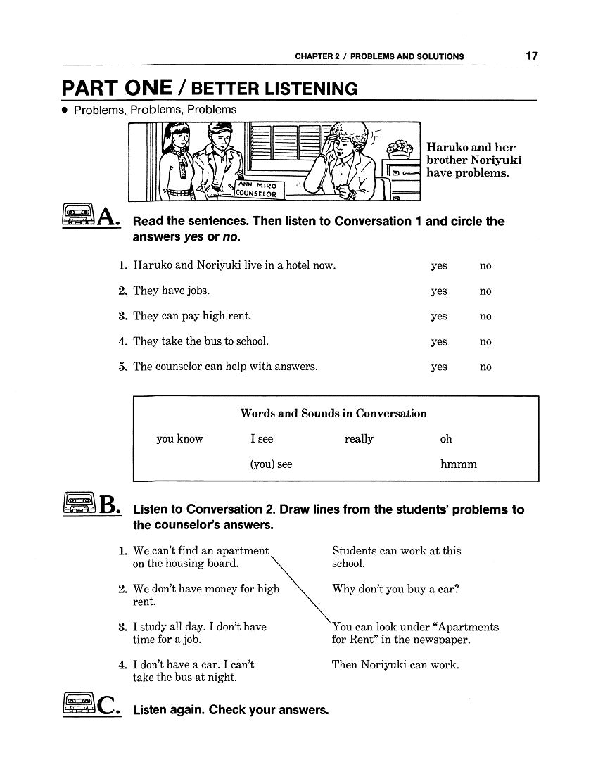 [2] On pages 17-18, speakers discuss common everyday “problems”—housing, money, studies, transportation. Show that you understand the Audio by responding True or False to comprehension statements. Notice some “Words & Sounds” typically inserted into Conversations. Match problem descriptions to suggested solutions.