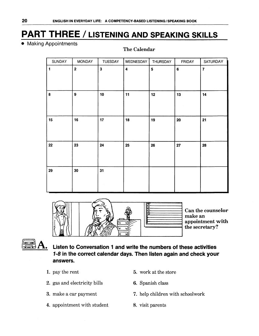[4] Part Three / Listening & Speaking Skills Audio contains typical exchanges working people might have when trying to find a time and place to get together. At first, you / your students may or may not “hear” the insertion of little words like a / an / the in fluent dialog, but eventually, you / they might. For real-life practice, (participants) make appointments with classmates to enter into your / their social “Calendar.”