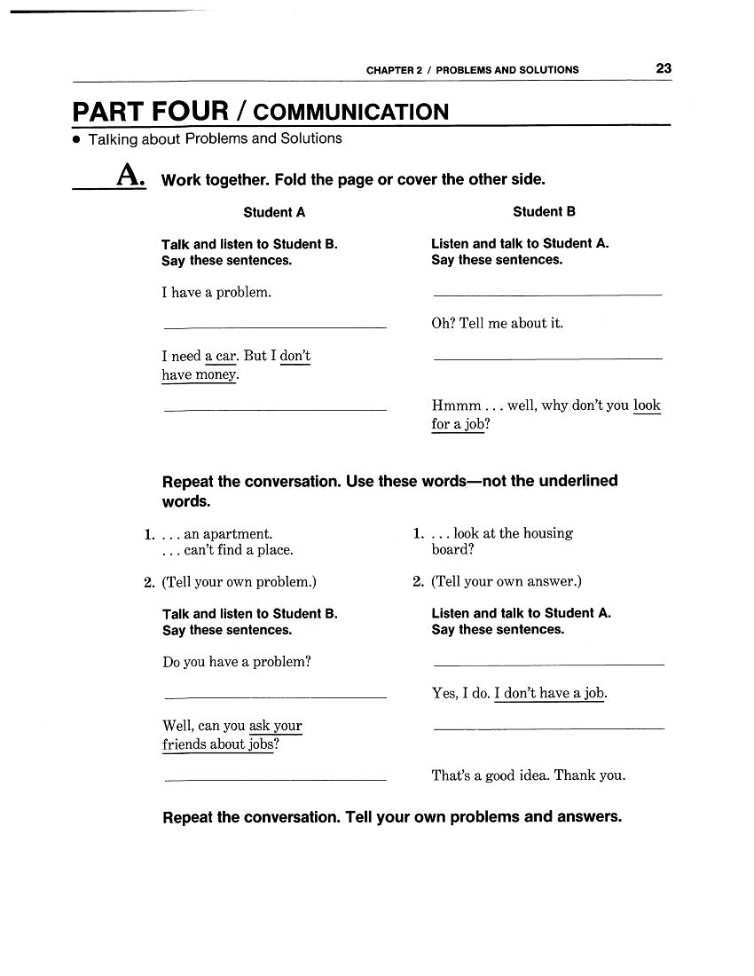 [5] Part Four / Communication gets pairs of learners together in (guided) dialogs about (typical or real) problems they have and how to solve them.