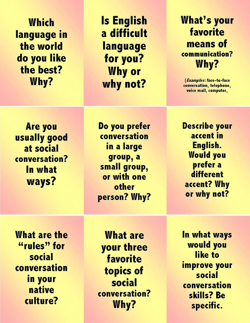 Intended for English language instruction at high beginning to advanced levels, the 72 Open-Ended Questions for Social Conversation in Download E-10.04b may or may not approach the depth of self– or world-exploration at sources like the above. Even so, they’re bound to evoke interest and engage participants who want to learn more about themselves and others. And they’ll save teachers, helpers, and students some work.