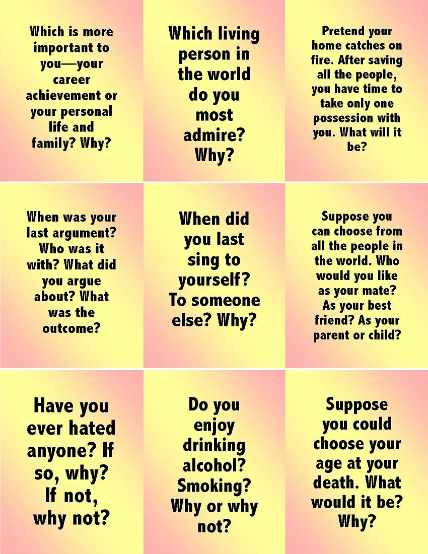 [1] Download the nine pages of E-10.04b: 72 Open-Ended Question Cards. Note that the items themselves appear on pages 1-8—to print out on stiff paper or card stock and to cut apart into nine Cards each. But before doing so—if you want each Card to have identifying info on its back, print page 9 on the reverse side of the first eight pages.