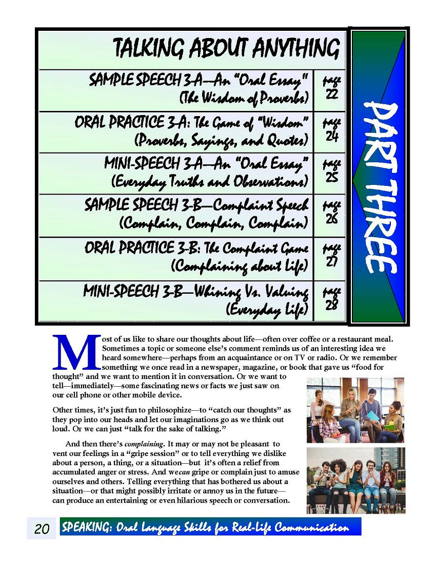 Part Three of Speaking: Oral Language Skills for Real-Life Communication = Talking About Anything, pages 20-28