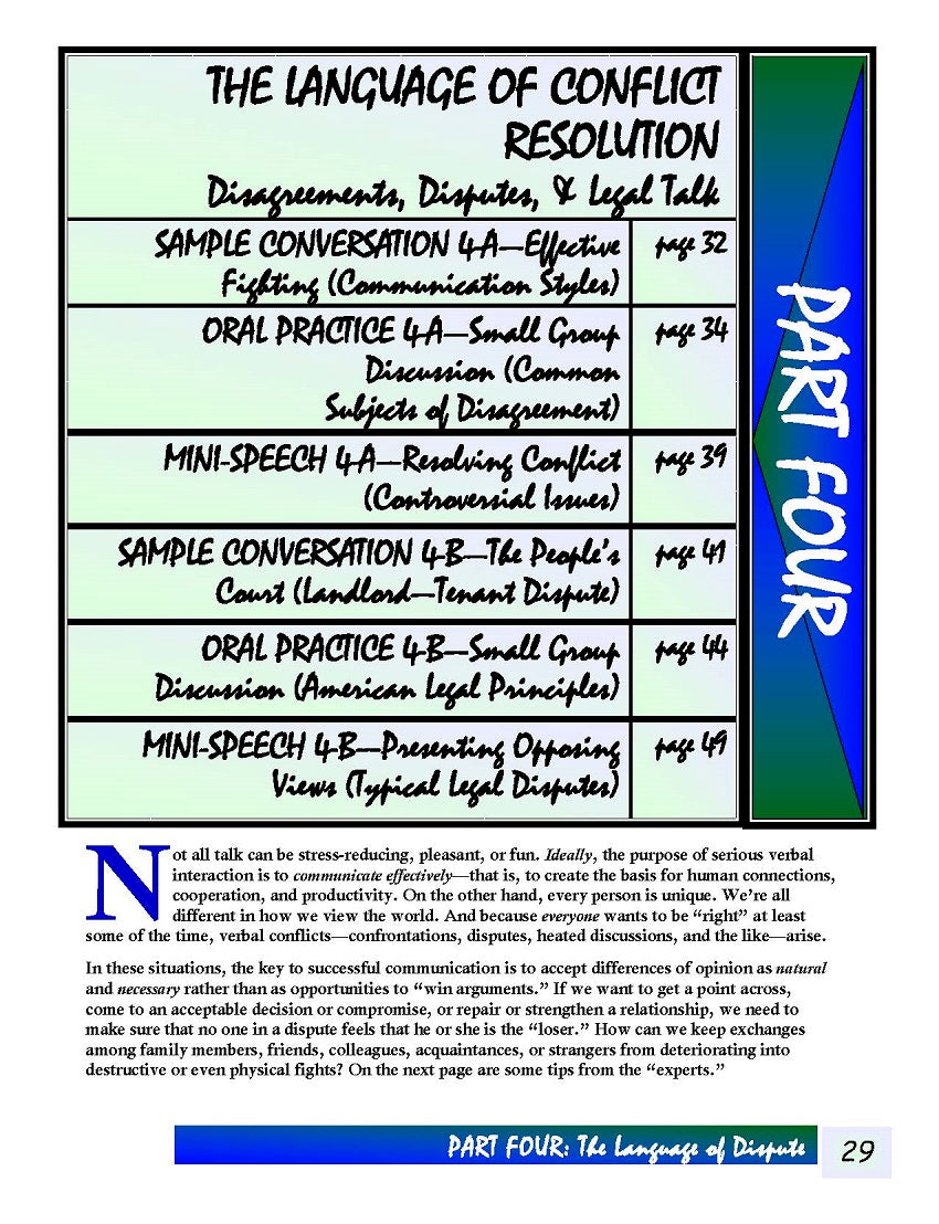 Part Four of Speaking: Oral Language Skills for Real-Life Communication = The Language of Conflict Resolution (Disagreements, Disputes, & Legal Talk), pages 29-50