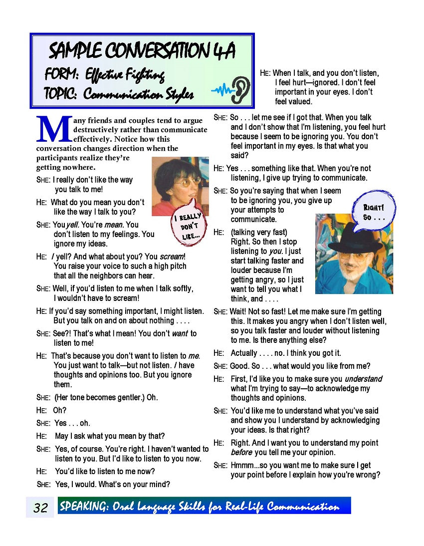 [1] Start out by thinking about how you generally go about resolving differences verbally. Hear Audio (and read) Sample Conversation 4A—about “Effective Fighting” between spouses. In Oral Practice 4A, engage in “Small Group Discussion” about arguments that might arise in Controversial Situations at school, work, or home or in the community. From a Chart, consider Phrasing effective in Beginning a Discussion, Presenting an Issue, Expressing an Opinion, Making a Point, Acknowledging, Disagreeing Constructively, Moving Toward a Solution. Use these and your own evolving wording to follow steps for Mini-Speech 4A: Exchanging Opposing Views.