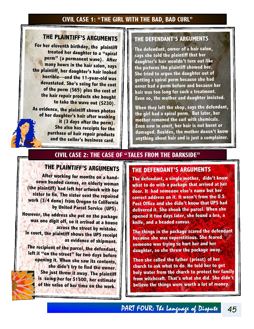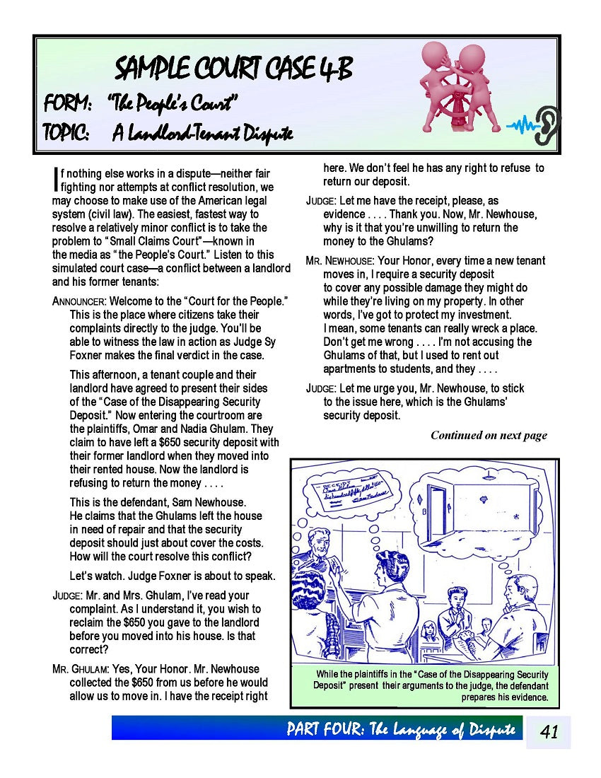 [2] In the three sections labeled 4B, hear a simulated “Court Case” on a landlord-tenant dispute. With explanation of Civil Cases 1-6, discuss plaintiffs’ & defendants’ arguments; then read, tell, and contemplate real judges’ decisions. Finally, conduct (act out) “mock trials” on actual or made-up conflicts of your own.