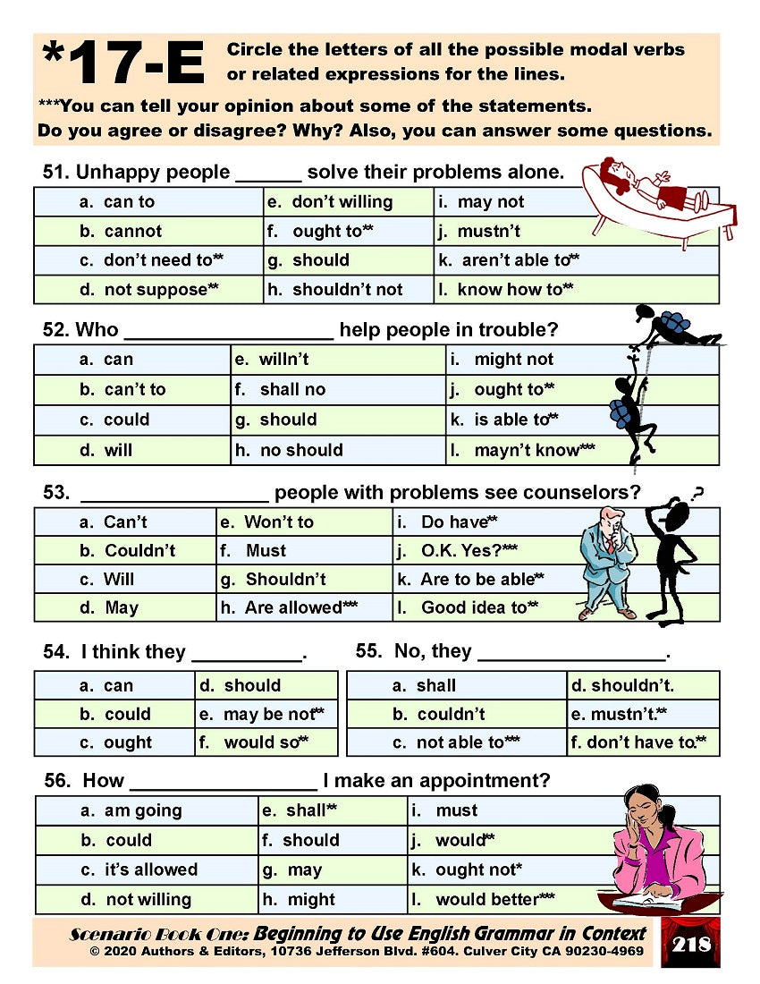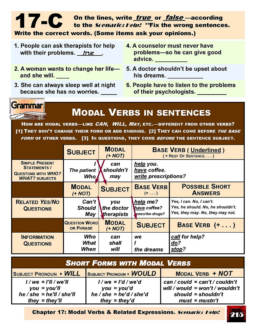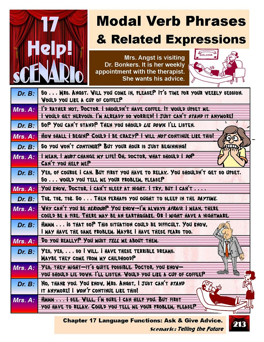 [1] Paying attention to the use of modal verbs and the ironic humor, act out the page 213 dialog between a “psychiatrist” and his “patient.” Complete Comprehension Checks 17-A, B, C. Review the Grammar: “Modal Verbs in Sentences” on page 215.