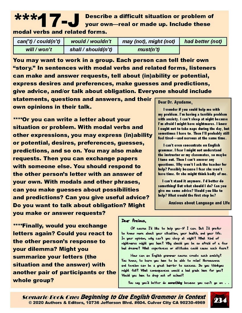 Chapter 17 (Modal Verb Phrases & Related Expressions: “Help!”) of the New Scenario Book One: Beginning to Use English Grammar in Context, pages 213-234