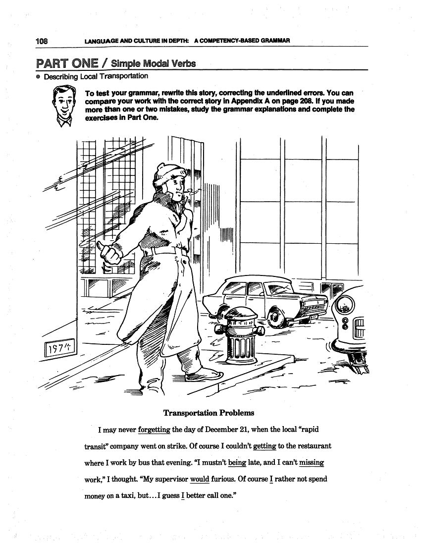 [1] To start Parts One, Two, & Three, first correct the errors in Simple, Continuous, & Perfect Modal-Verb Phrases (respectively) in stories titled “Transportation Problems,” “the Rules of Bus Travel,” and “Air-Travel Mistakes.” After absorbing the pedagogy of each part, choose correct words in Exercise A. Complete sentences in Exercises B (& *C). Then tell your own story; re-correct your version of the original anecdote of that section.