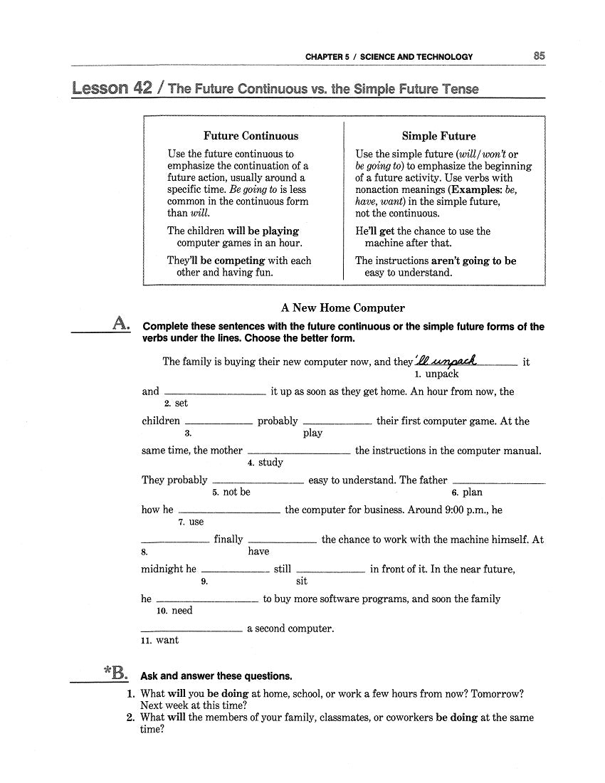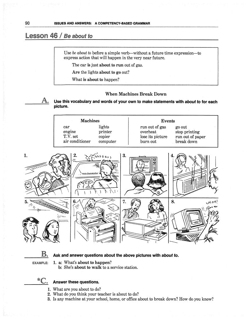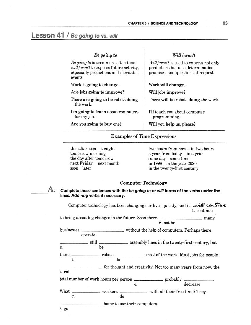 [2] On page 83, notice the sections of Lesson 41: Be Going to vs. Will. These divisions are a boxed presentation/explanation that includes comparison + examples of adverbial time expressions; a directed (controlled) Exercise A; and a drawing to describe with vocabulary cues in Exercise B. Then come starred (*) “beyond the text” Exercises *C and *D, which—though outdated, will give text users a chance to talk about their smart-phones and other uses of devices.
