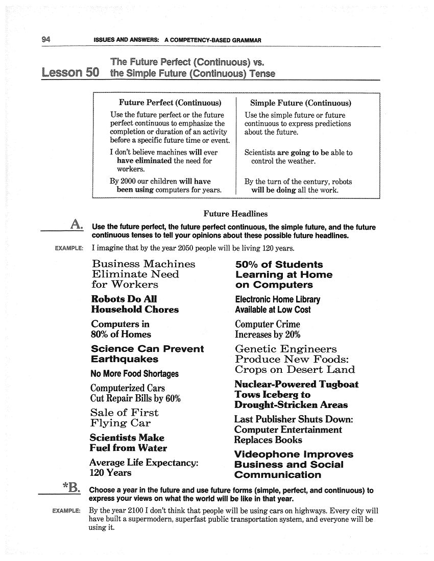 Lessons 41-50 of Chapter 5: the Future (“Science & Technology”) of WorkLife English Grammar 6: Issues & Answers, pages 82-94