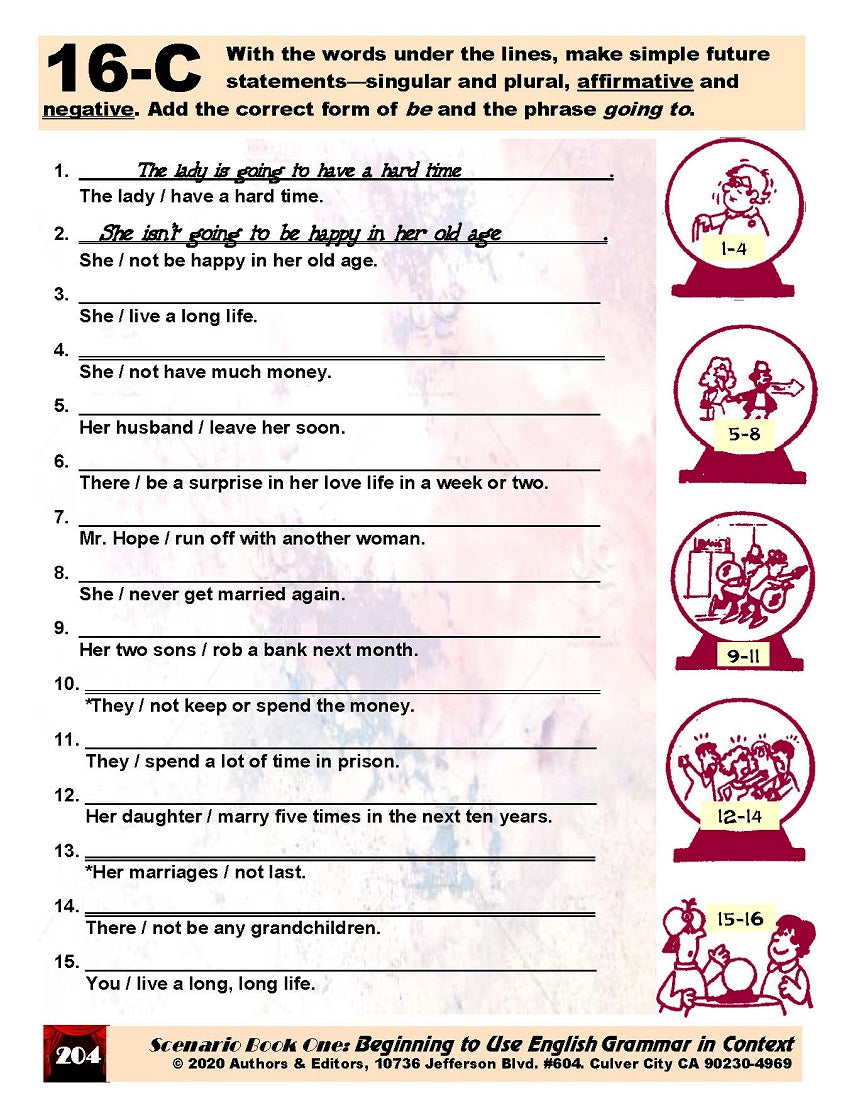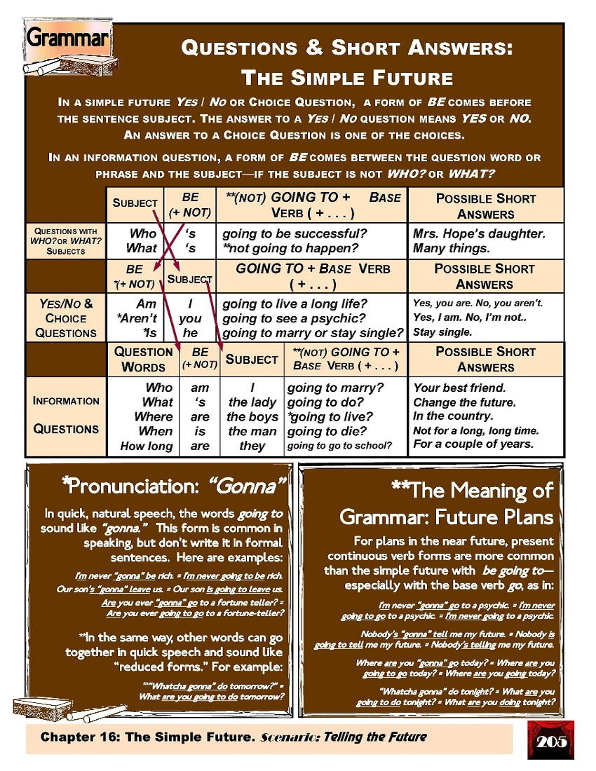 [2] For pedagogy (Will-Statements, Questions, & Short Answers) and Exercises (* ** ***) 16-E on pages 208 to 211, repeat or adapt procedures suggested in Step [1] above. Enjoy summing up the grammar and content with your own ideas and language in page 212 culminating Activities **(*)16-F.
