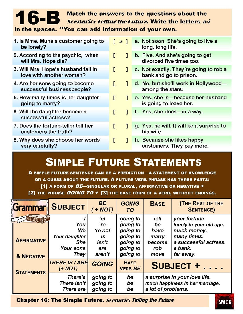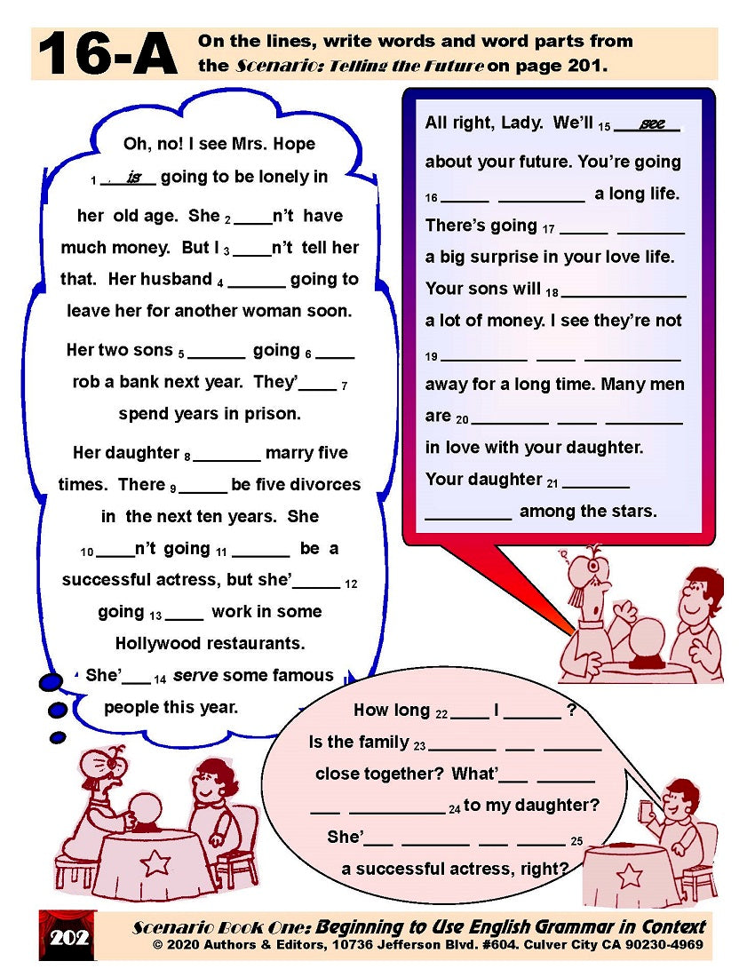 [1] Paying attention to the use of verb tenses with satiric humor, act out the page 201 dialog between a “crystal-ball gazer” and her “customer.” Complete Comprehension Checks 16-A & B. Review the Grammar: “Simple Future Statements, Questions, & Short Answers” on pages 203 and 205. Noting the additional commentary offered in Sidebars, on pages 204-207, do Exercises 16-C-*16-D.