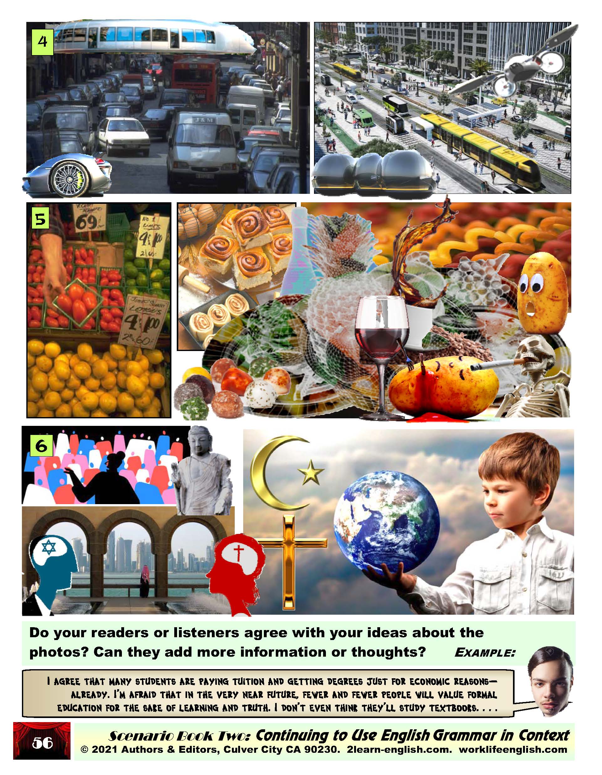 Why It’s Useful: The attractive layout and imaginative images in this multicolored, renovated, and augmented version of Unit 2 of the original Scenario Volume Two: English Grammar in Context may encourage text users, motivating them toward more precision in their speculations about the world to come. Reading (aloud) the “Life in the Future” Scenario, participants will get used to varying their verb phrasing in talking or writing about the future. They’ll continue to build ability with Sentence-Structure (Statement, Question, & Answer) Tables & Grammar Notes; Comprehension & Practice Exercises; simulated “Realia”—and Dialogs + Speeches to complete.