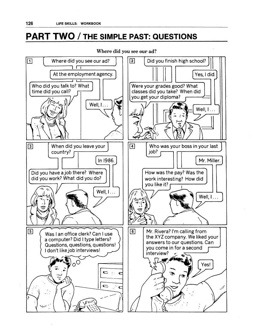[2] Act out and read aloud the page 126 Part Two: the Simple Past: Questions Strip Story “Where did you see our ad?” Follow instructions for the grammatical pedagogy and exercises that follow on pages 127-130.