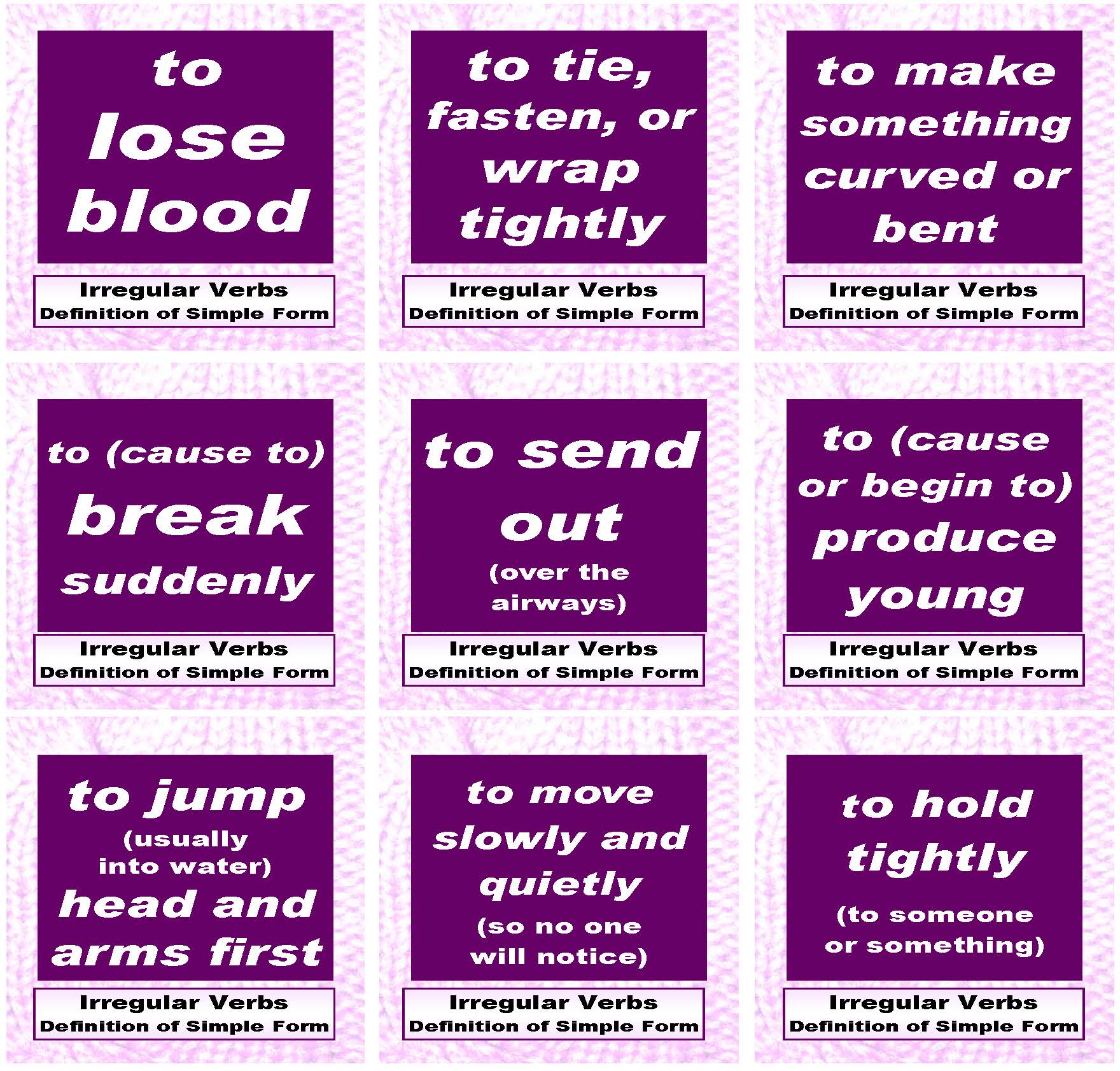 [1] From the Advanced Verb-Forms Cards file, print out all 36 pages back-to-back, flipped horizontally. (You might also print out pages single- sided: then the 324 card faces—three verb parts, each with a definition, an illustration, or contexts] can be arranged into 54 sets-of-six for use in other educational activities.) Cut apart the 162 double-sided (or 324 single-sided) cards so that they’re all the same size and shape.