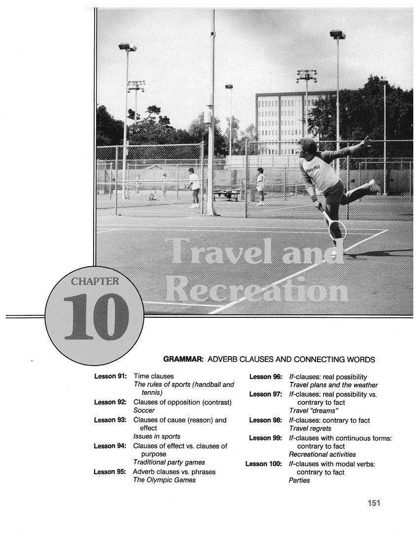 Lessons 91-100 of Chapter 10: Adverb Clauses & Connecting Words (“Travel & Recreation”) of WorkLife English Grammar 6: Issues & Answers, pages 151-167