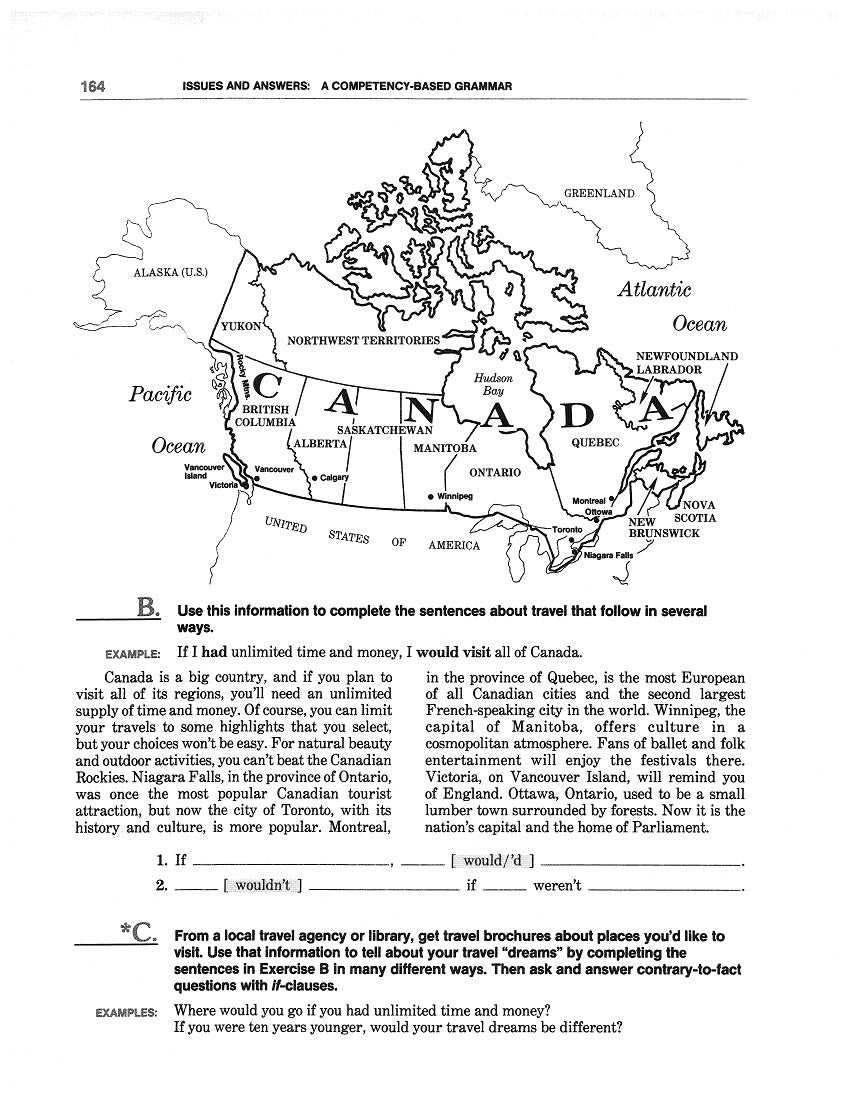 [3] Lessons 96-100—all on the subject of “Recreational Travel,” deal with If-Clauses. These can convey “Real Possibility” (for instance, dependent on the weather). They can compare reality with hypotheticals in revelation of “Travel Dreams”—and make “coulda-woulda-shoulda” statements in disclosure of “Travel Regrets.” Finally, in If-Clauses with Continuous Forms and Modal Verbs, they can tell about “Recreational Activities” and “Parties” didn’t turn out as well as had been expected. Although they’ll be less than ideal, enjoy your (imperfect) trips and games!