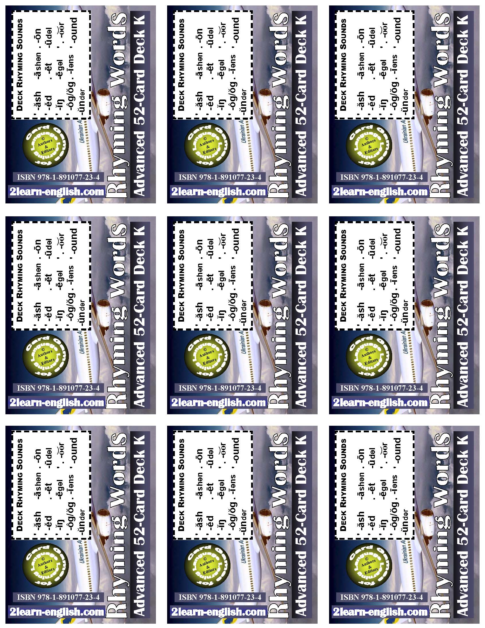 [1] Print out and cut apart the 52 two-sided Advanced Rhyming-Word Cards in Deck K. Look them over, interpreting the multi-syllabic phonetic notation on the card faces and backs. Note that they can be divided into 13 separate sets of 4 items each that rhyme in their final or last two syllables.