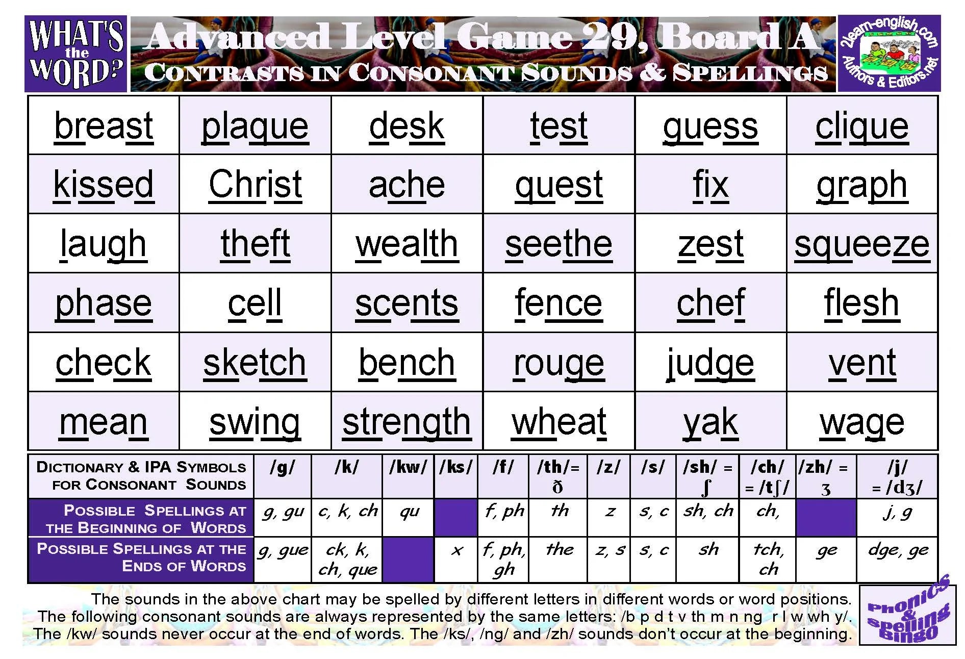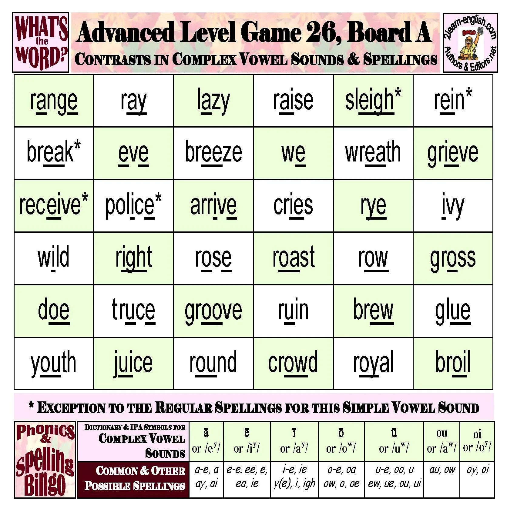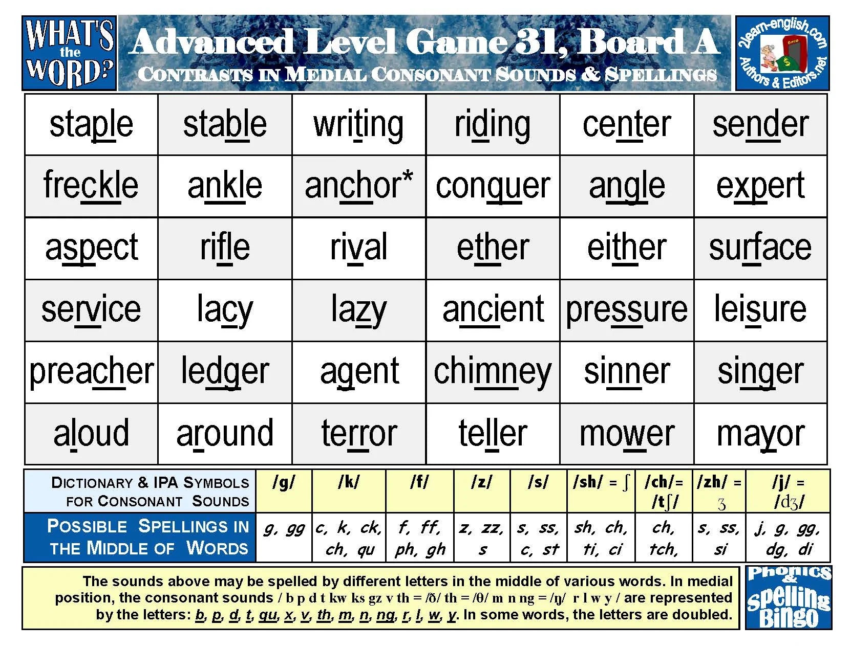 covers all possible spellings of 7 "simple" vowels in Game 25; of 7 "complex" glides and diphthongs in Game 26; of all 14 vowels in Games 27 & 28; of contrasts in 12 initial and final consonant sounds and spellings in Games 29; of 7 "short" or "long" vowel sounds before -r in Game 30; of medial consonants in Game 31; and of exceptional consonant spellings + silent consonants in Game 32