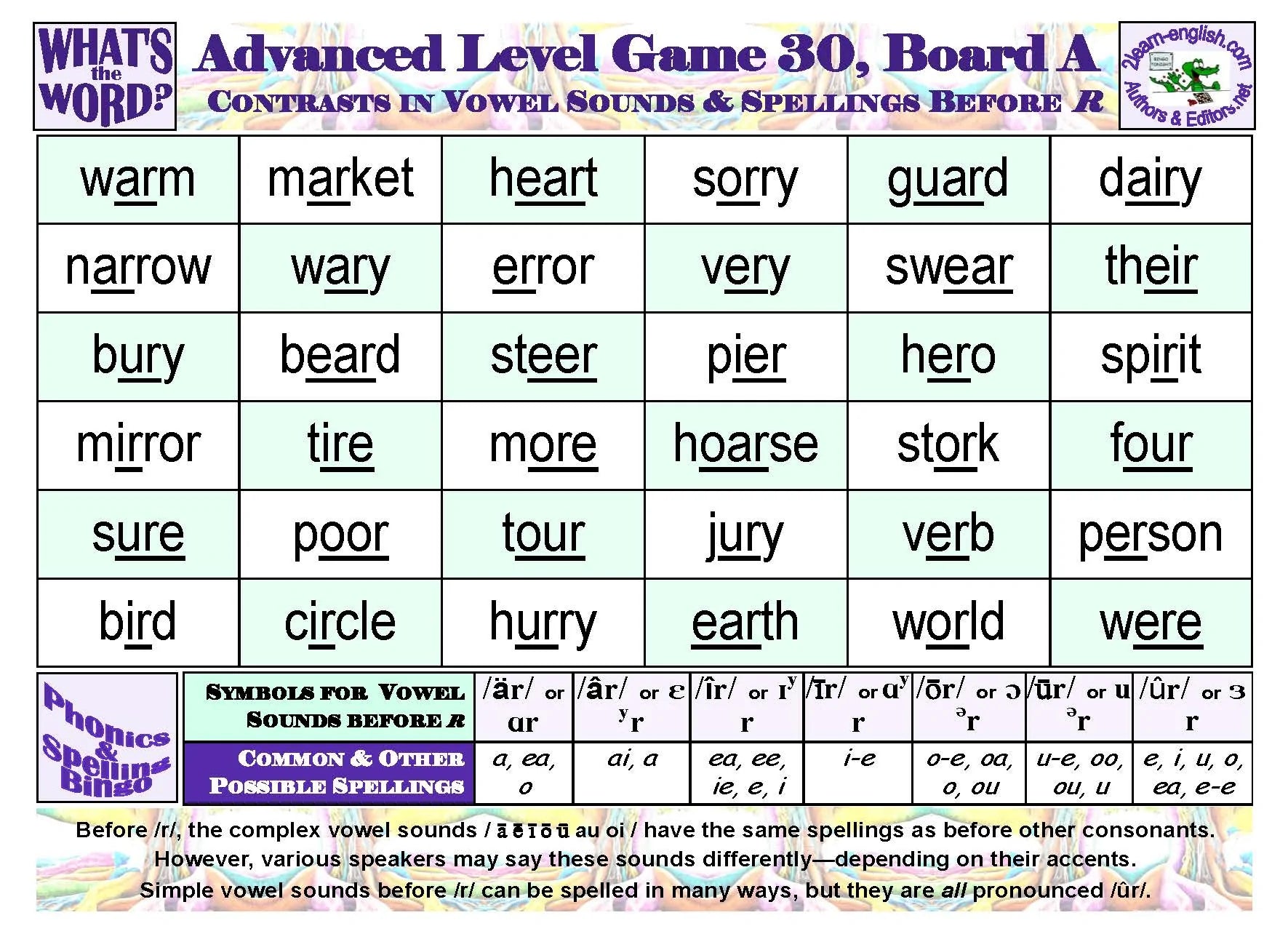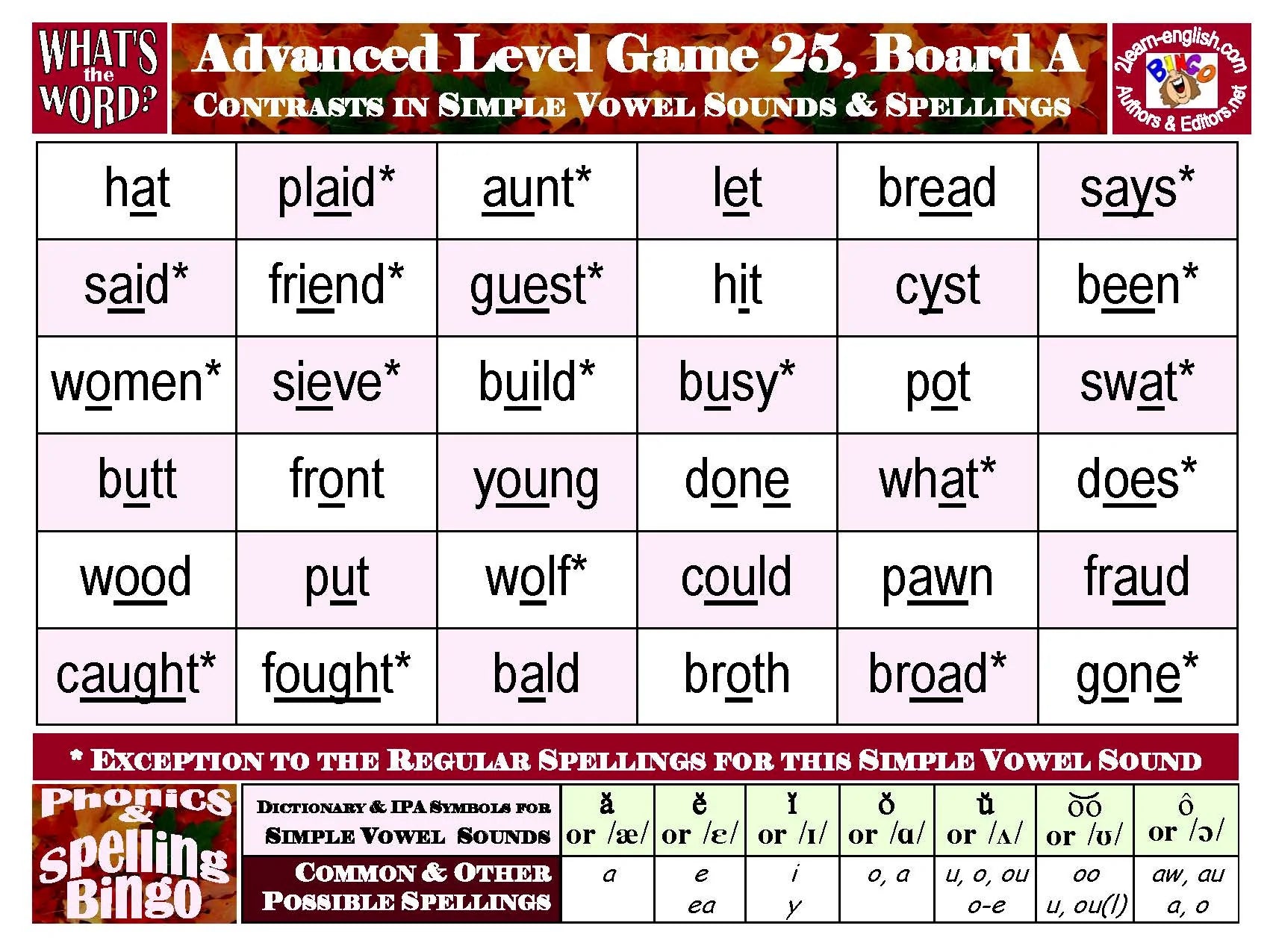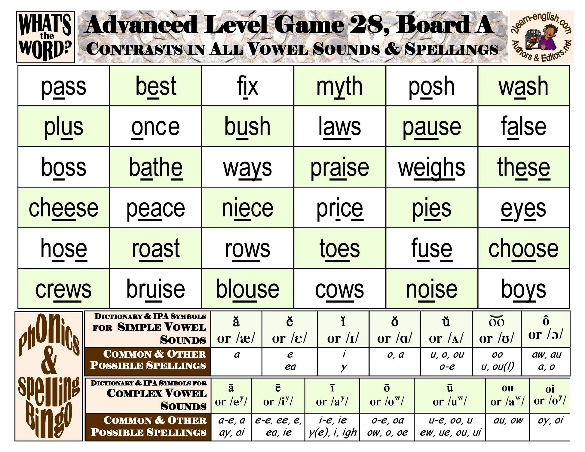exposes materials-users to examples of one- and multi-syllable vocabulary representative of nearly all ways to pronounce and spell words in American English. These appear in 8 Games of ten 36-item Boards each, displaying text only--with relevant pedagogy below
