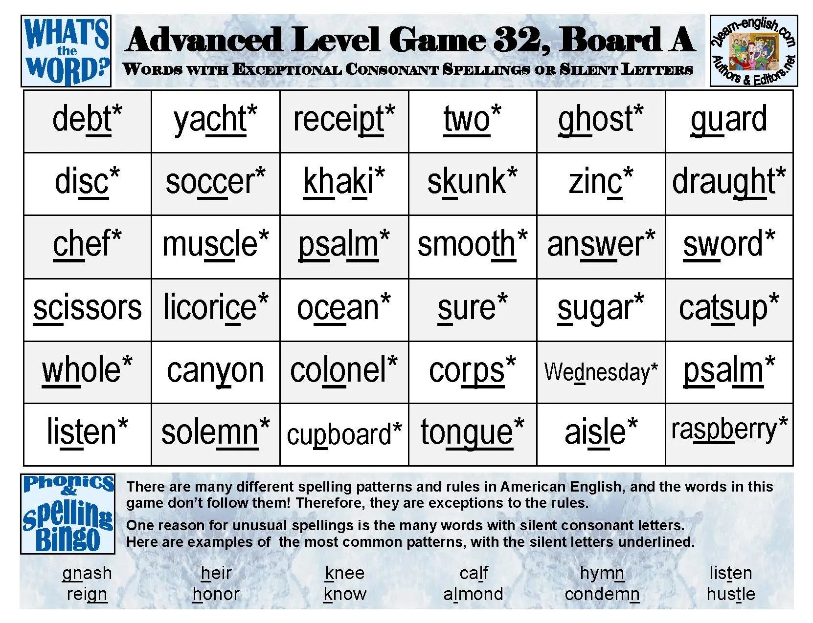 8 separate Bingo Games 25-32 with 80 Boards displaying 288 one- and multi-syllable words with nearly all regular, alternative, irregular, unusual, and exceptional American-English spellings. There are also 8 Sets of Caller Cards to be cut apart and used in a creative variety of ways. A 60-page Activities & Ideas Book offers all the benefits of the three that precede it at lower levels, and more. In only 13 half-sized pages, it answers the question "What patterns/principles should language learners master at Advanced Levels?