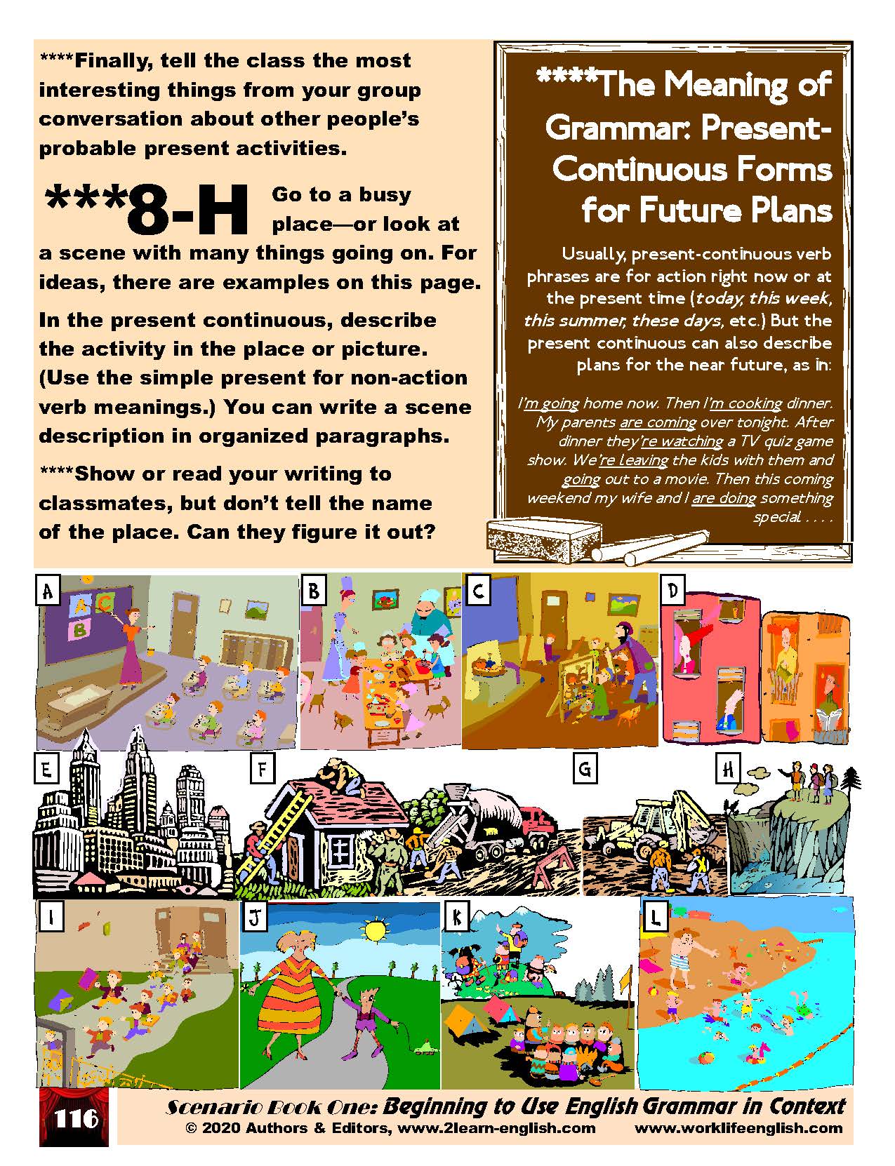 [1] In the page 105 Scenario, read (aloud) the two travel letters, noting that “action verbs” appear in the Present Continuous while “non-action verbs” are in the Simple Present. Keeping the forms + meanings in mind, complete Comprehension Checks 8-A to 8-C, go over rules and patterns (including those for spelling –ing Verbs), and do any of the following Exercises/Activities 8-D to ***8-H that seem productive.