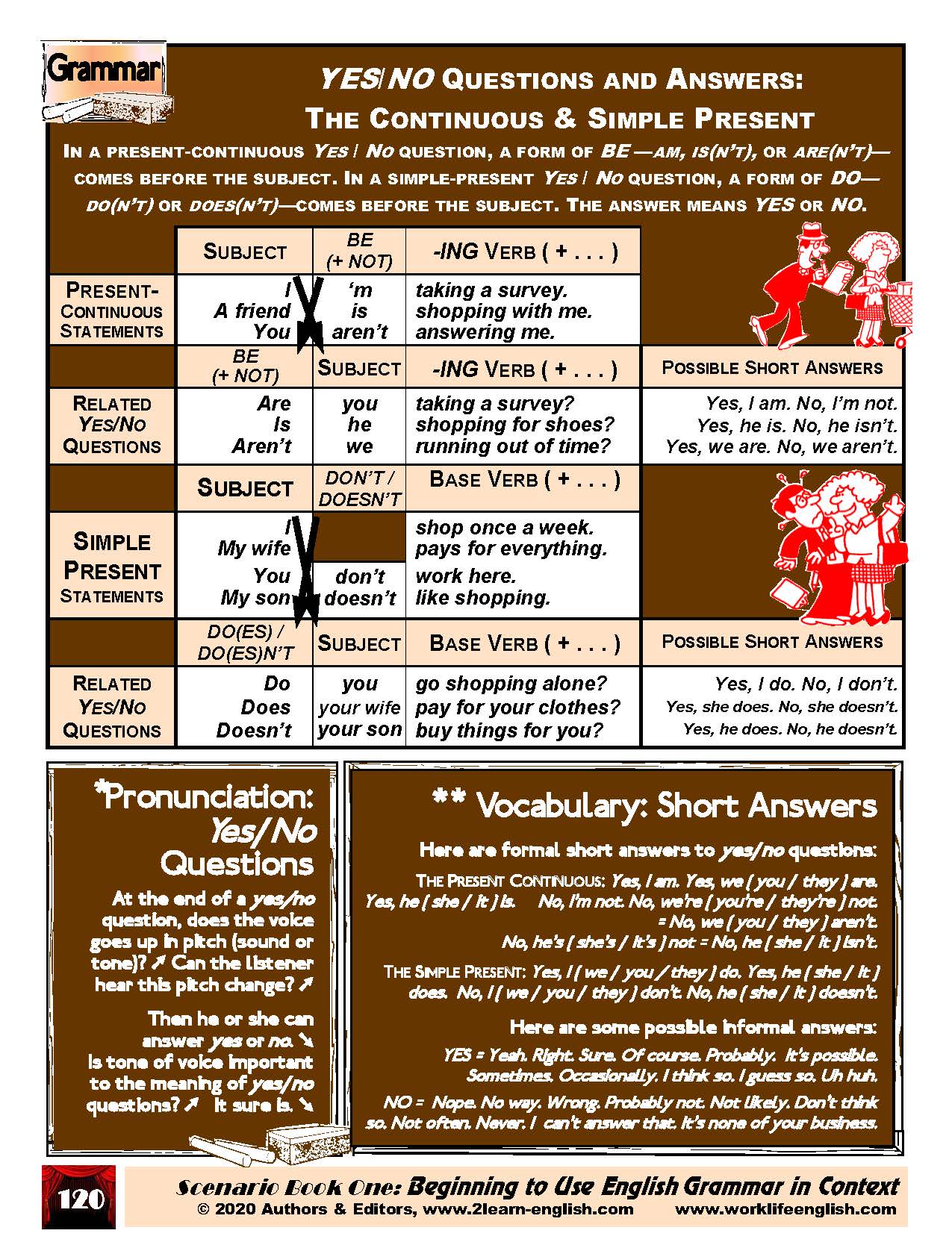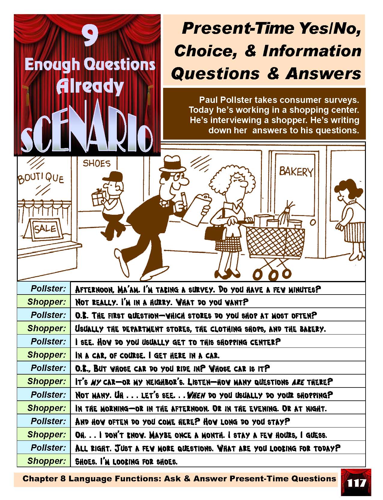 Chapter 9 (Present-Time Yes/No, Choice, & Information Questions & Answers: “Enough Questions Already!”) of the New Scenario 1: Beginning to Use English Grammar in Context, pages 117-130