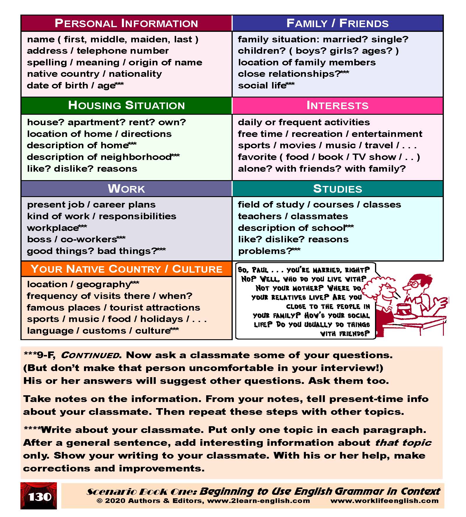Why It’s Useful: In an info-gathering (for sales purposes) world, students of language psychology are likely to either hate or want to explore Question & Answer Processes. Here’s a “Grammar-in-Context” chapter that not only supplies Present-Time Sentence Structure, Vocabulary, & Content but that will also evoke reaction to today’s culture of “interactive processes.” It’s instructive to experience how an “issue” (like invasive grilling vs. protection of privacy) can enhance grammar learning.