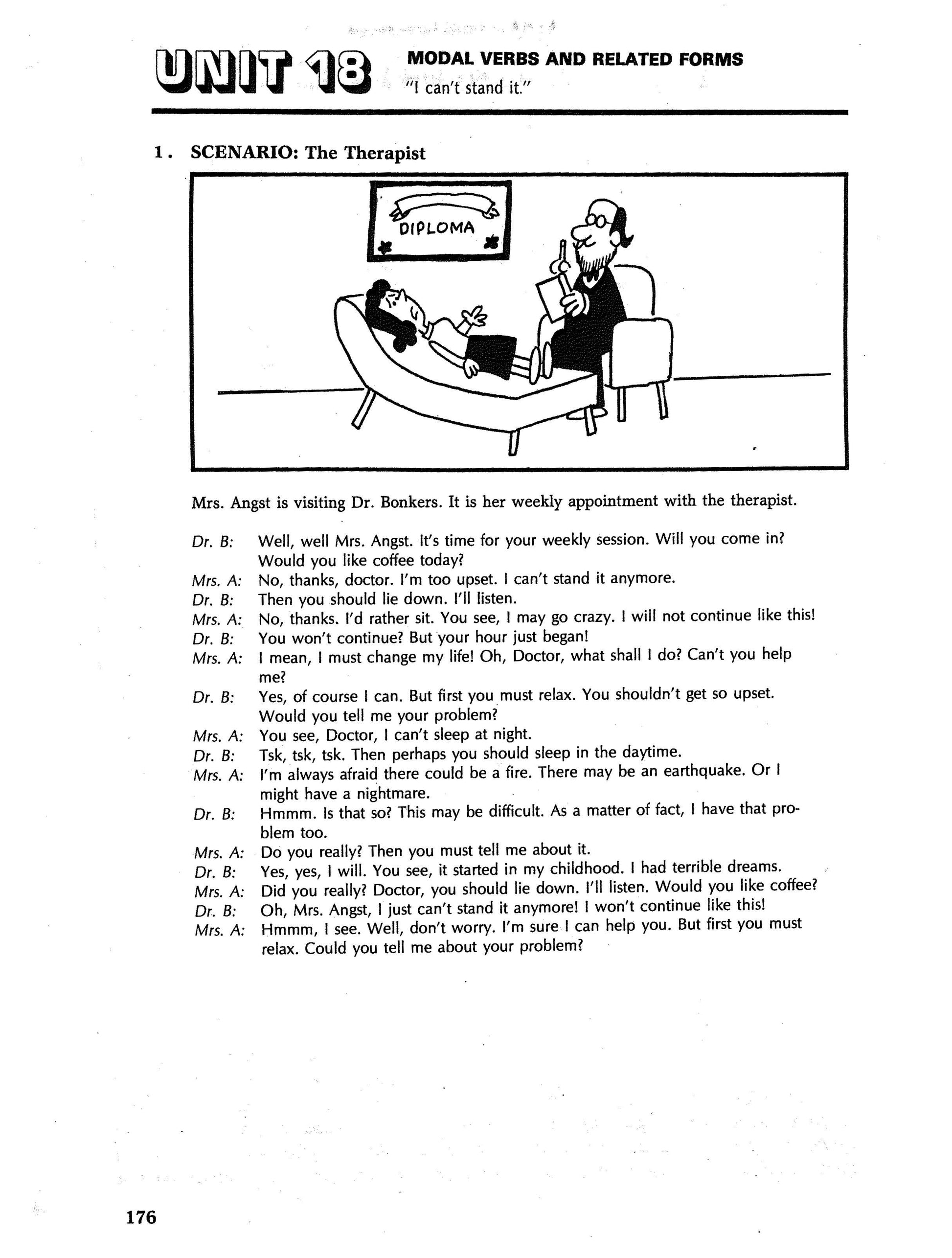 Unit 18 (Modal Verbs & Related Forms: “The Therapist”) of the Original Scenario 1: English Grammar in Context, pages 176-195