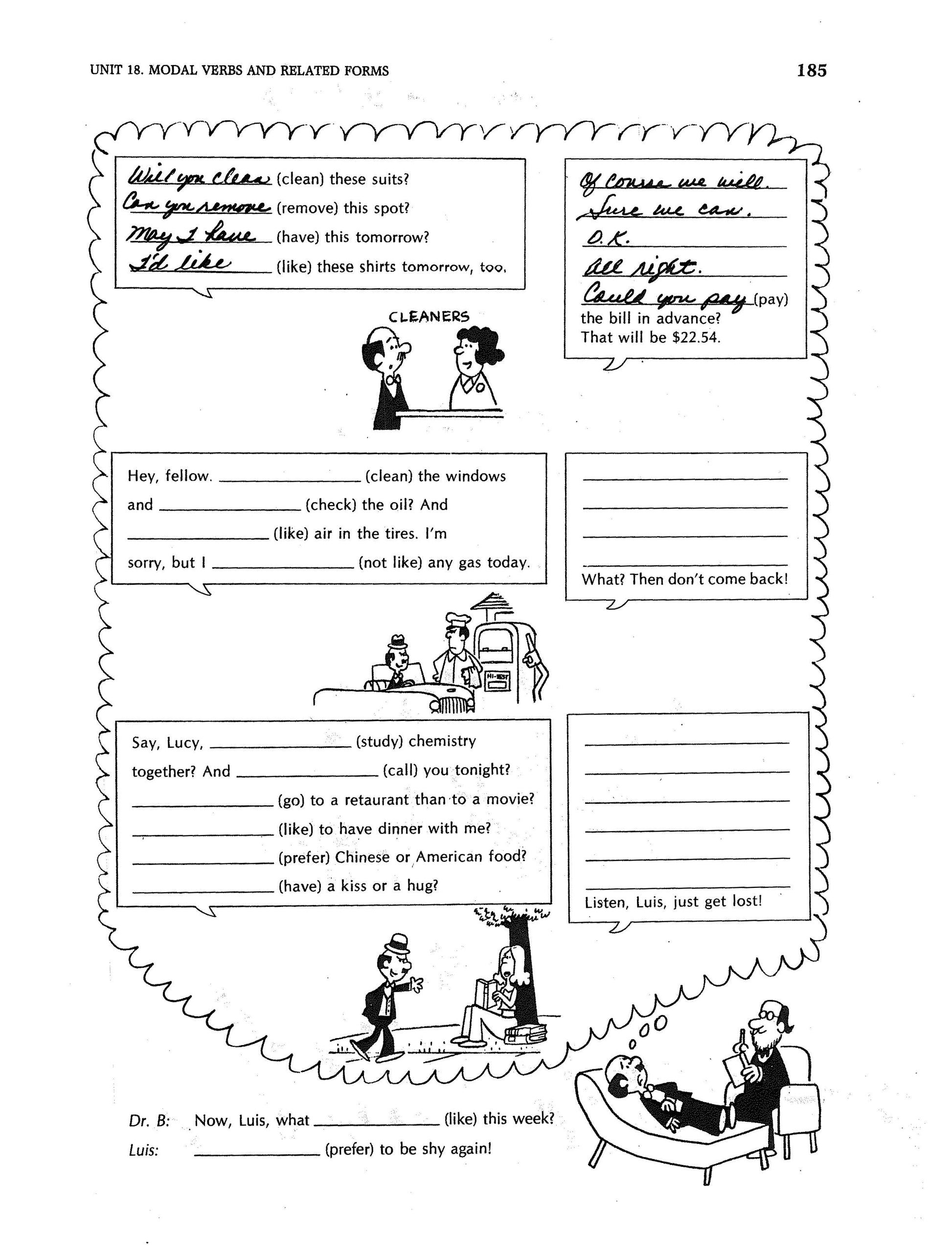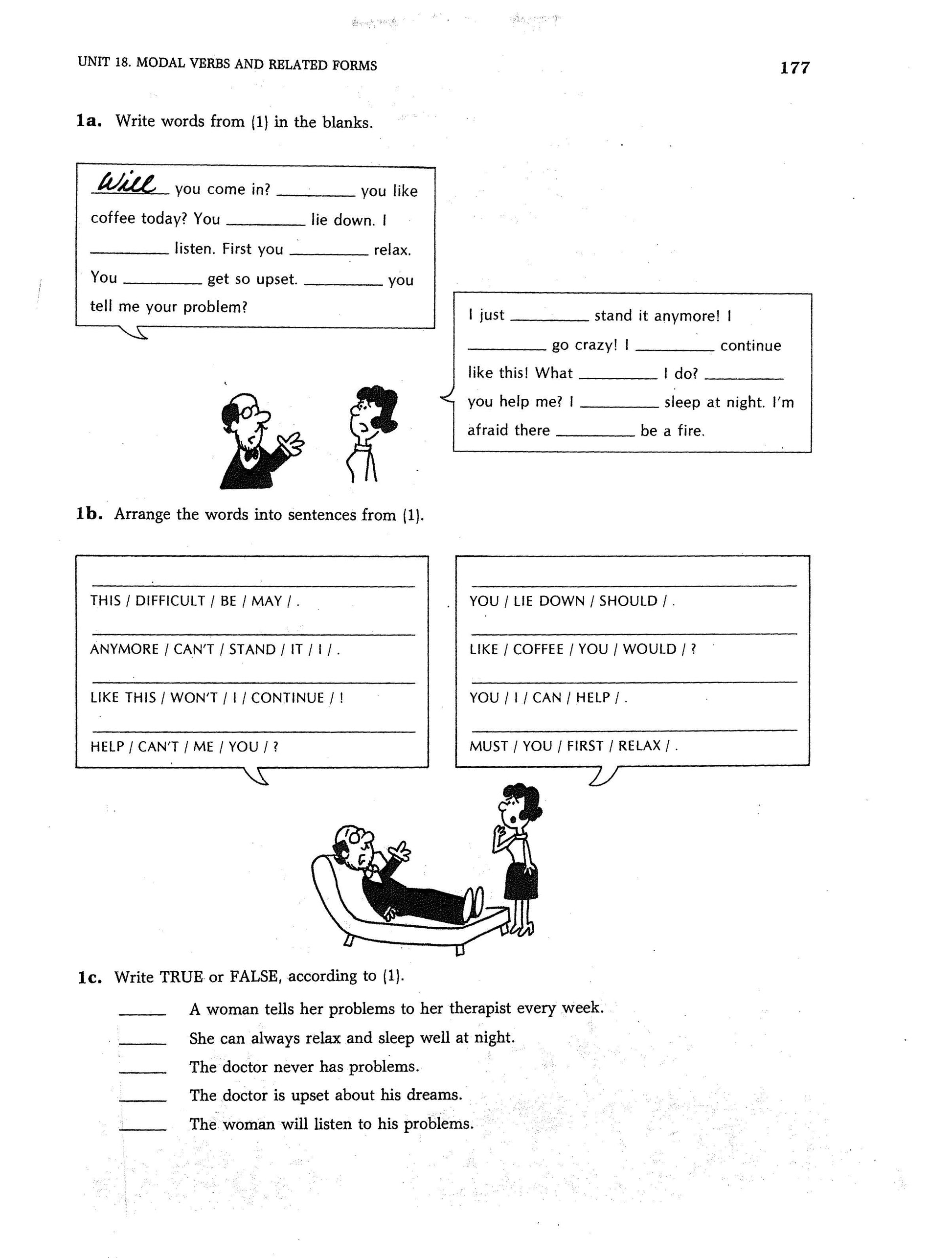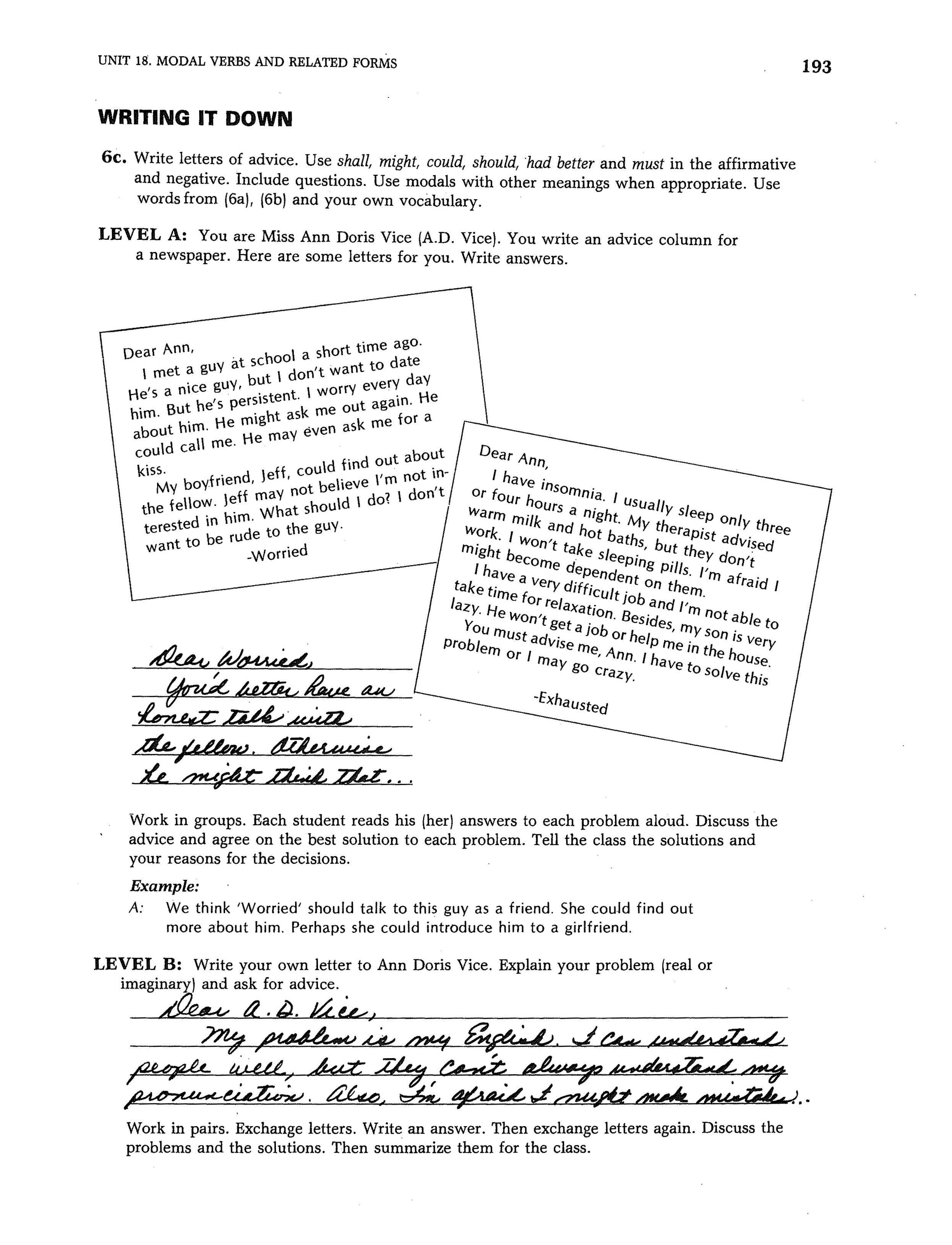 [1] Have fun with the pun-heavy page 176 Scenario, “I can’t stand it,” which satirizes traditional lie-down therapy sessions. In doing Comprehension Exercises 1a-1c, notice the structure and meanings of modal-verb phrases. In boxed Grammar Explanations + related Exercises 2a-2f (forms + patterns) and 3a-3g (meanings), , incorporate the rules and patterns into your repertoire. Using your developing “feel for language,” enjoy the Level A and/or Level B “Talking It Over” Role-Plays on page 186 (3b), pages 188-189 (4d), and page 190 (5b). Produce and answer “Letters of Advice” in the “Writing It Down” section on page 193.