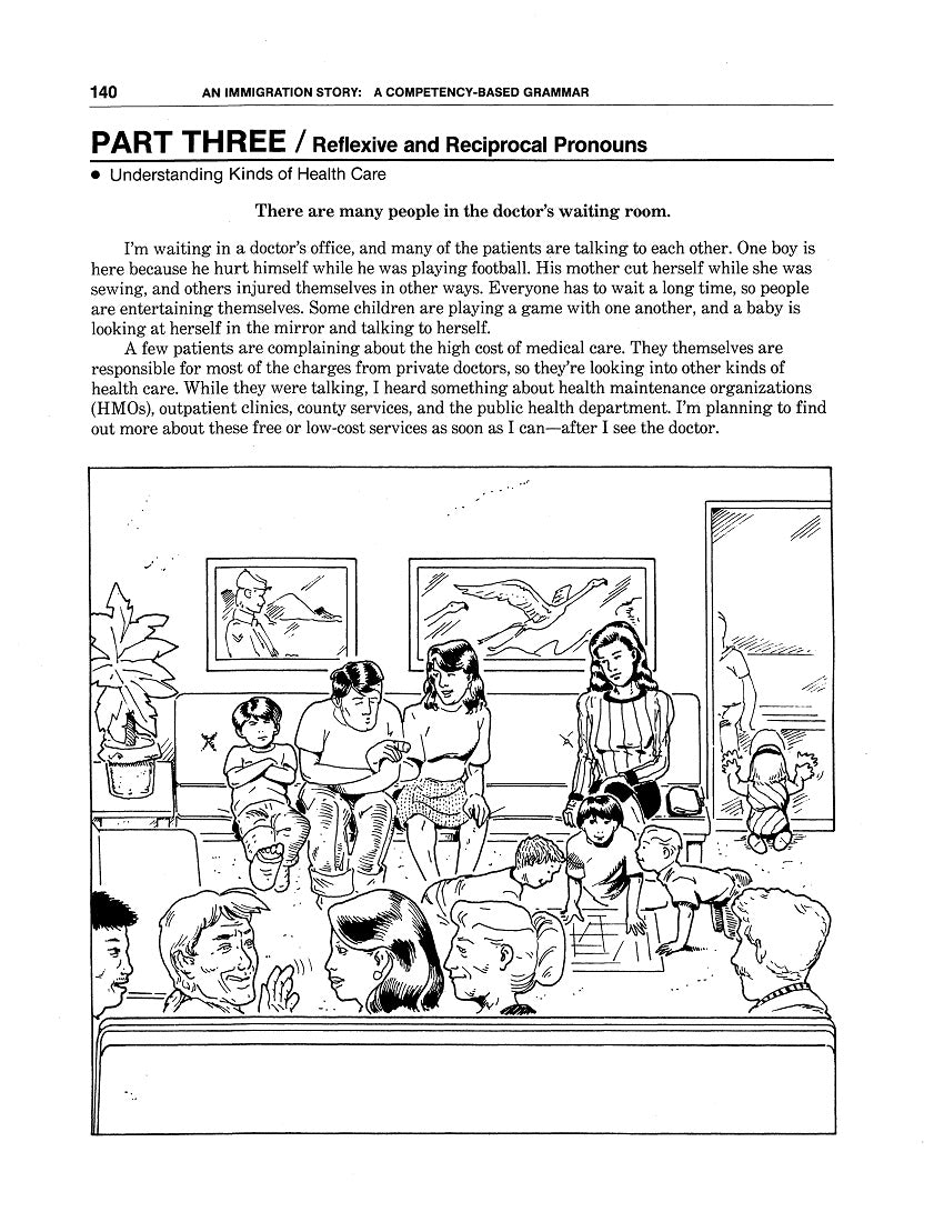 [1] On page 140, look at the drawing “There are many people in the doctor’s waiting room.” Think (and tell) what you know about “Personal, Reflexive, Reciprocal Pronouns.” Identify these in the introductory reading. Check and update your knowledge with the patterns and notes in the Grammar Boxes that follow.