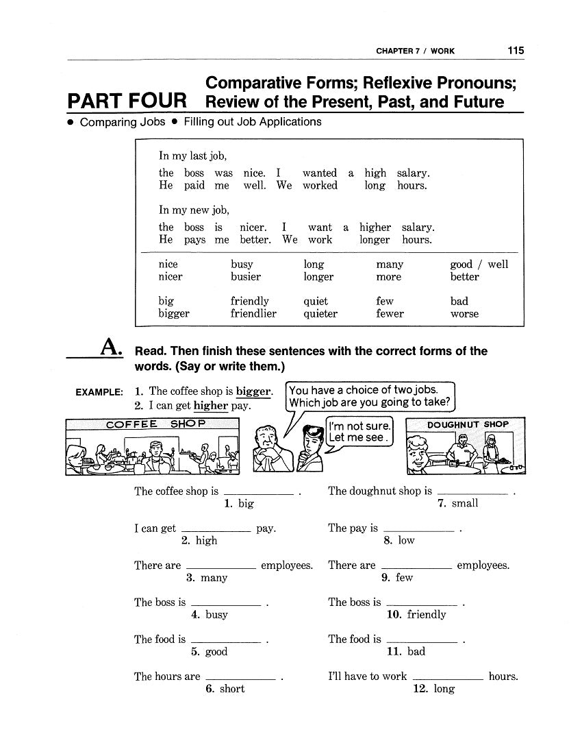 [1] In Part Four of Chapter 7, with the given examples, practice the comparative forms of one-syllable adjectives, noting spelling changes and irregular forms that occur when adding -(e)r. To compare the aspects of two job situations with each other, insert the forms into Exercise A. Then in B-C, contrast these with comparatives of multi-syllabic adjectives (and adverbs), which follow more.