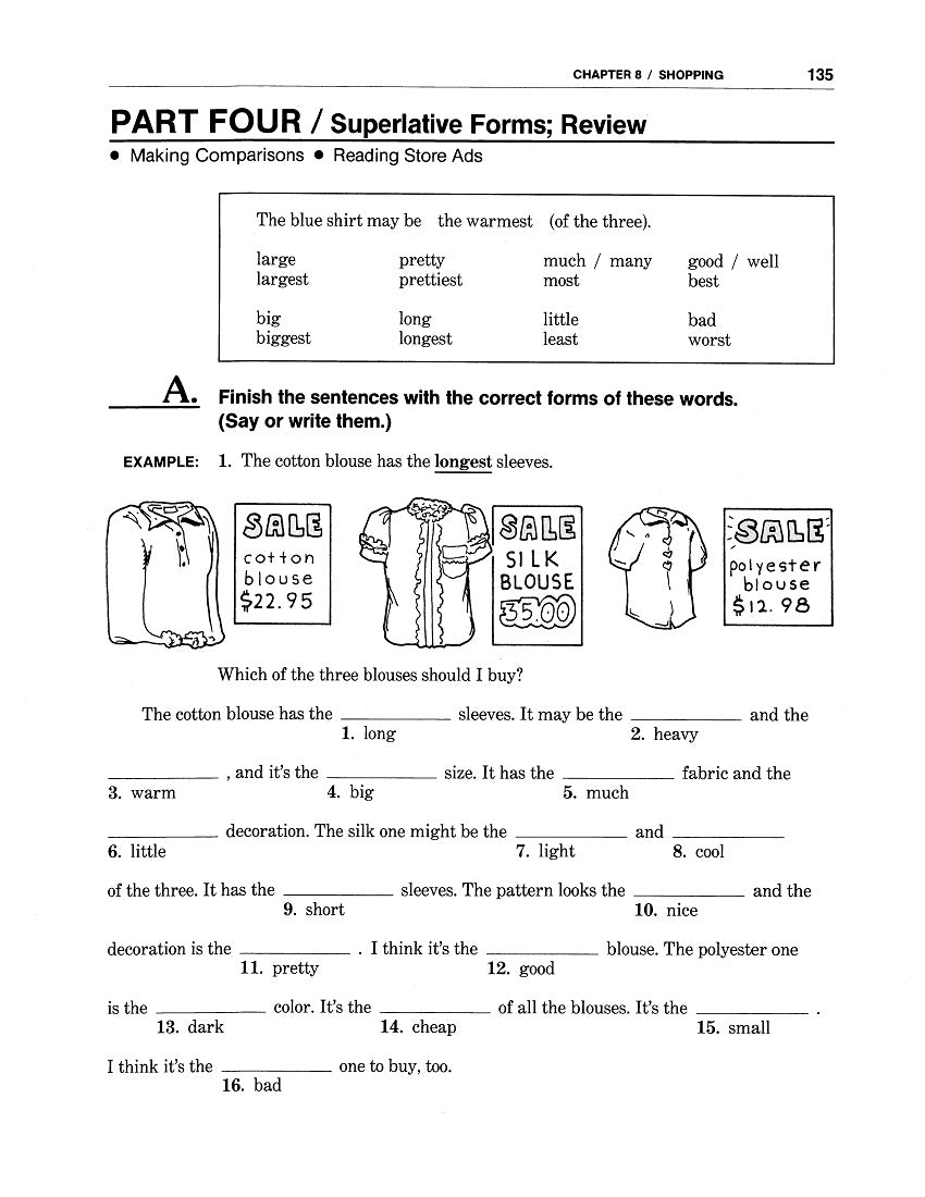 Part Four: Comparative Forms of Chapter 7 (“Work”); Part Four: Superlative Forms of Chapter 8 (“Shopping”) of WorkLife English Grammar 2: English in Everyday Life, pages 115-116 & 135-137