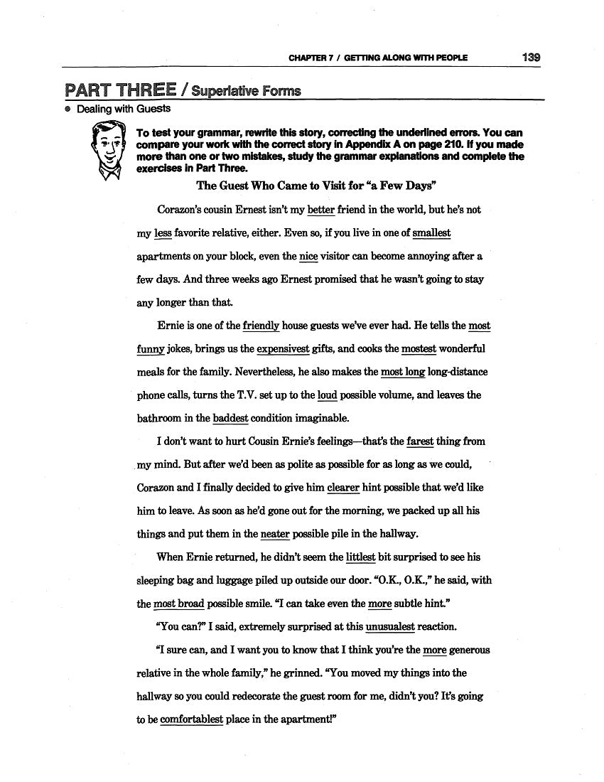 [3] While focusing on forms (regular spelling + irregulars) and contextualized uses of superlatives, follow comparable procedures to correct and learn from a Part Three Story, “The Guest Who Came to Visit for ‘a Few Days” with relevant exercises.