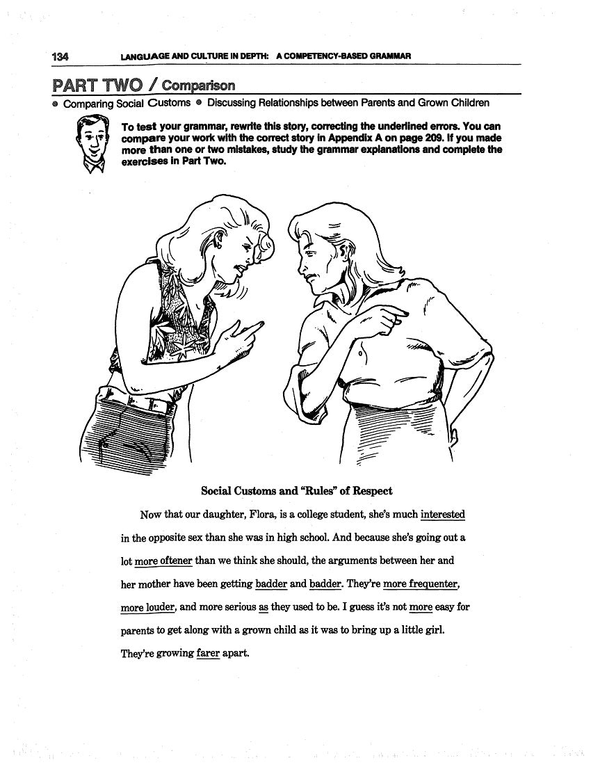 [2] In a Part Two Story called “Social Customs & ’Rules’ of Respect,” test your knowledge of the positive I+ comparative degrees of adjectives and adverbs. Learn what there is to know about forming comparatives for use in sentences, including “doubled” ones. “Prove” your skills in cultural comparisons of “social rules.”
